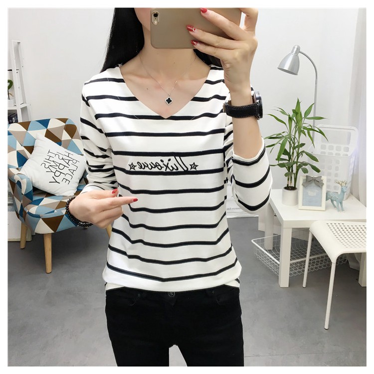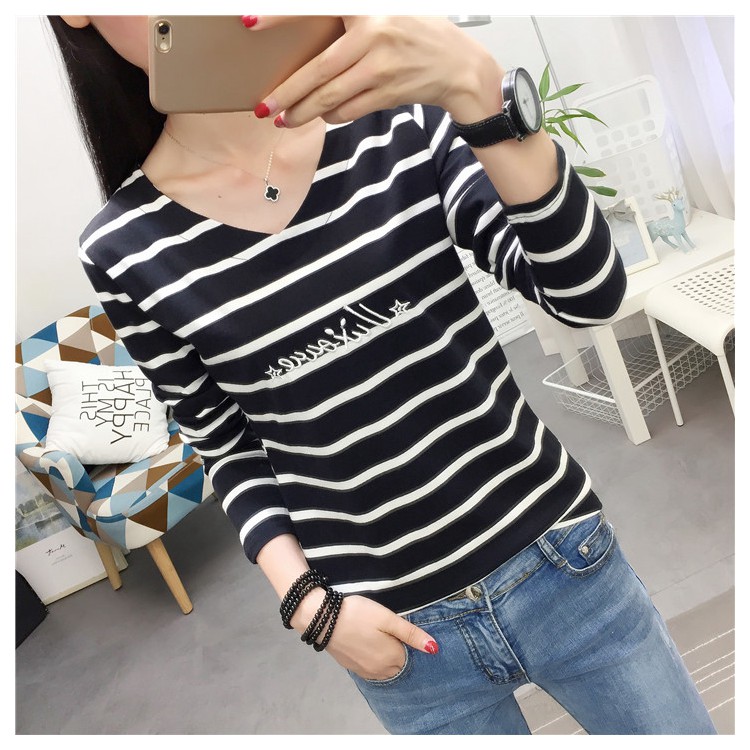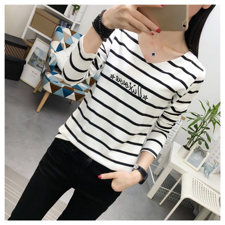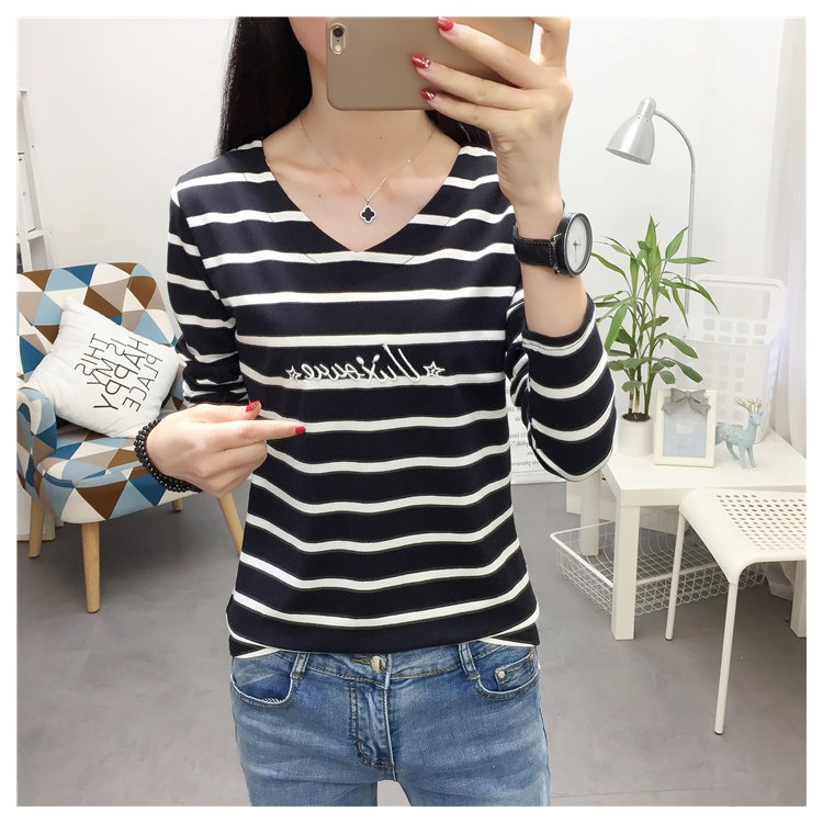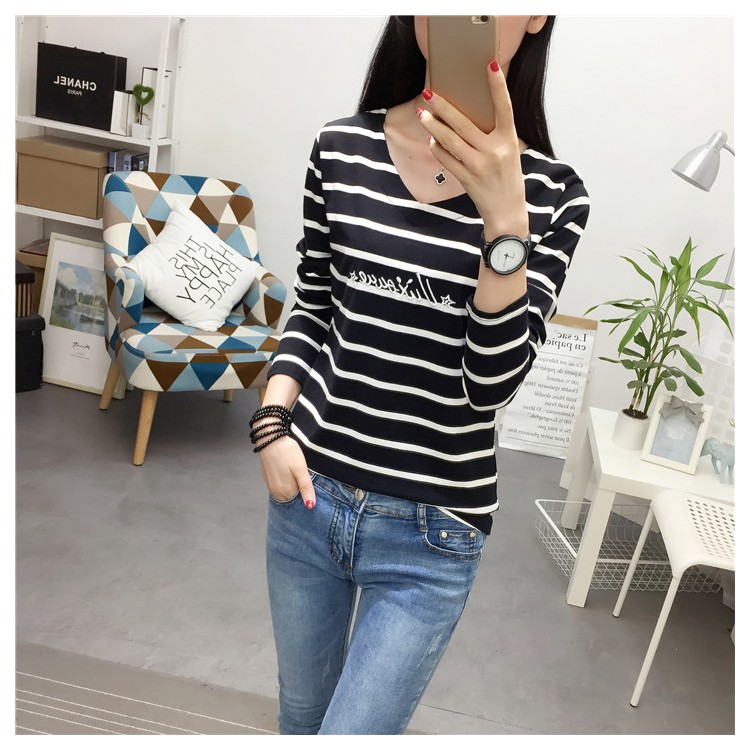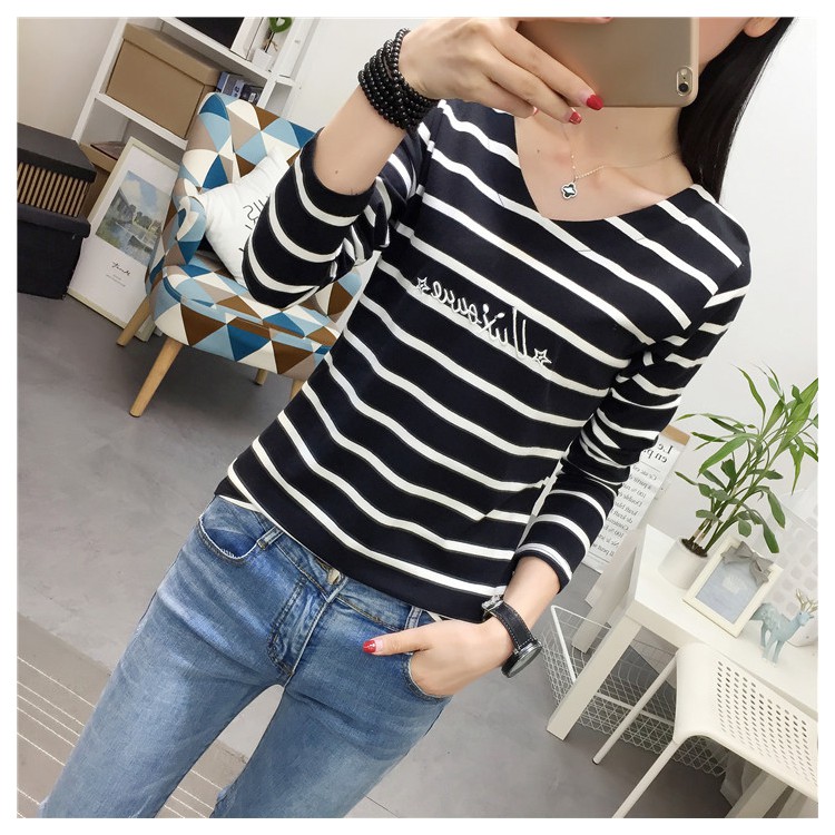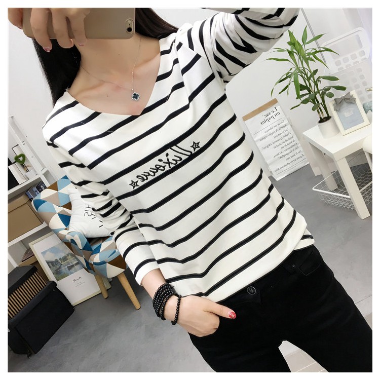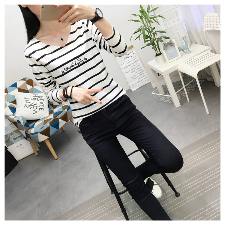 黑白條紋純棉字母春季上衣女2018新款修身顯瘦內搭打底衫長袖t恤