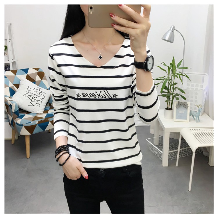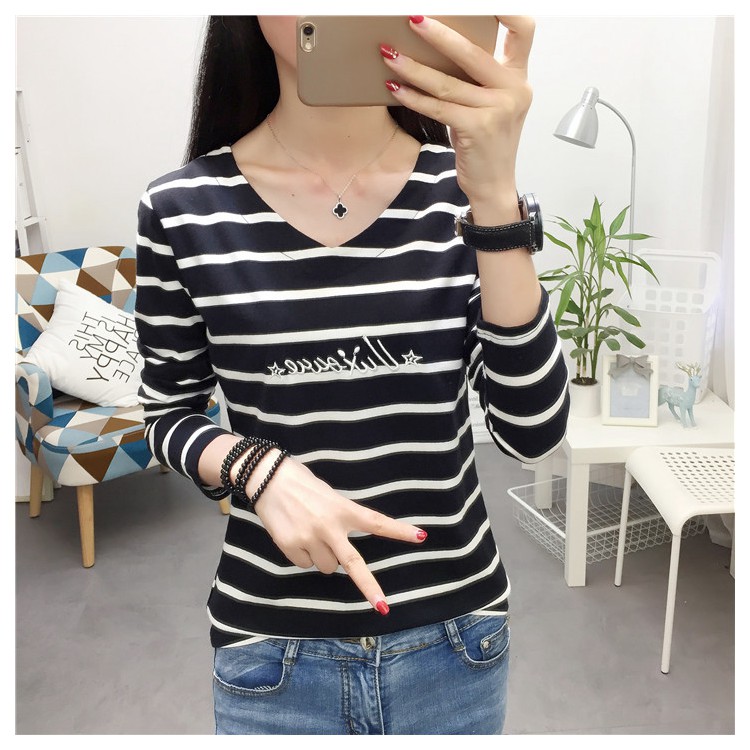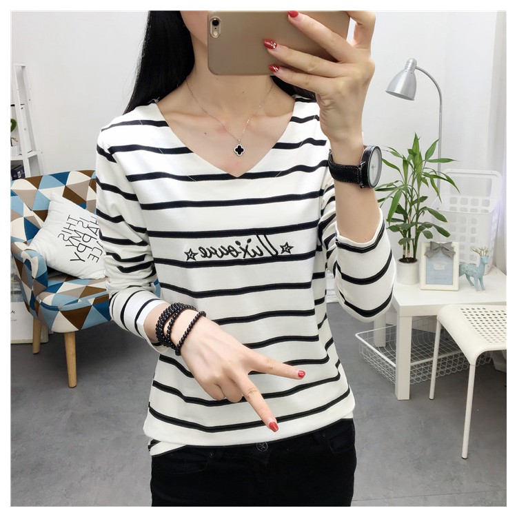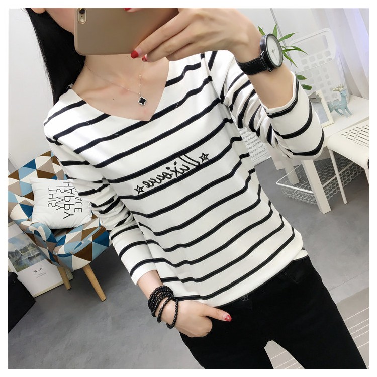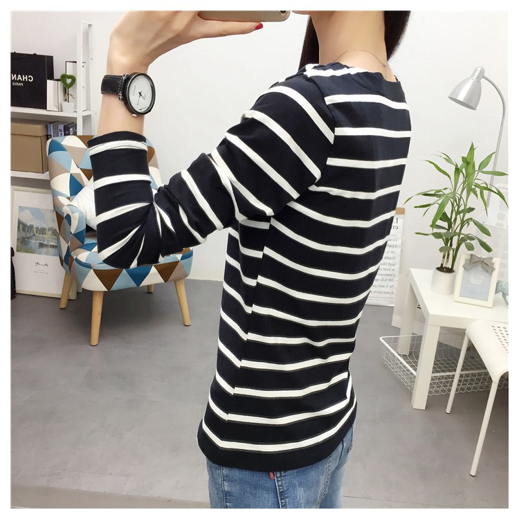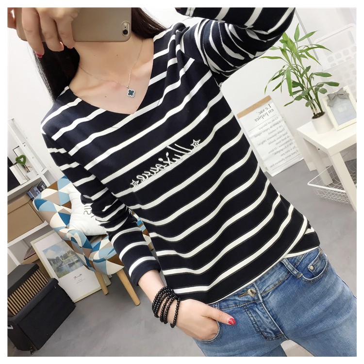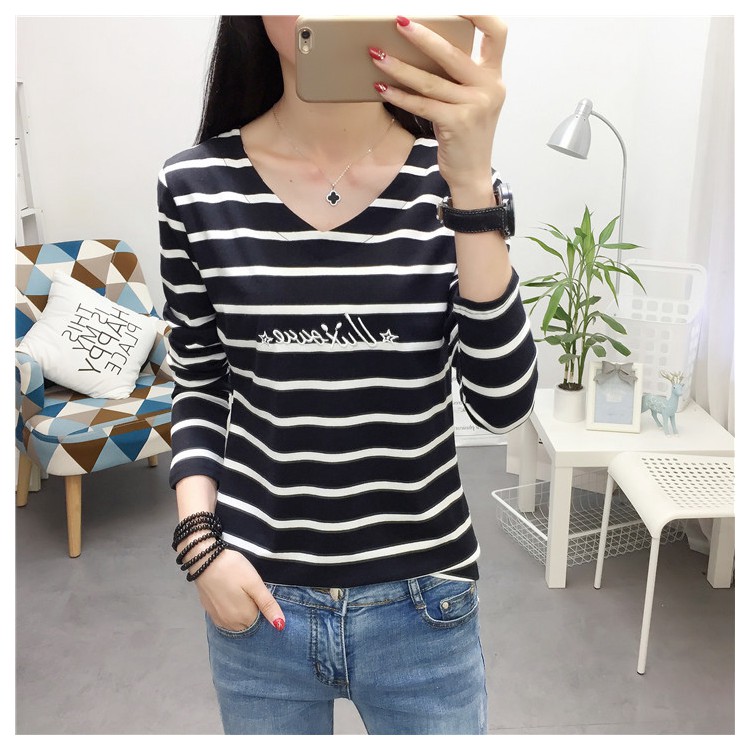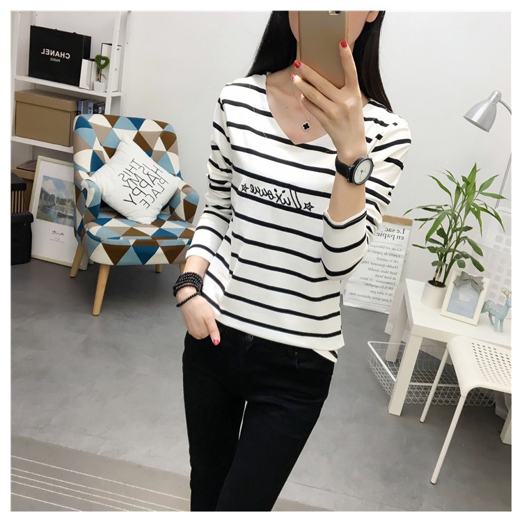 黑白條紋純棉字母春季上衣女2018新款修身顯瘦內搭打底衫長袖t恤