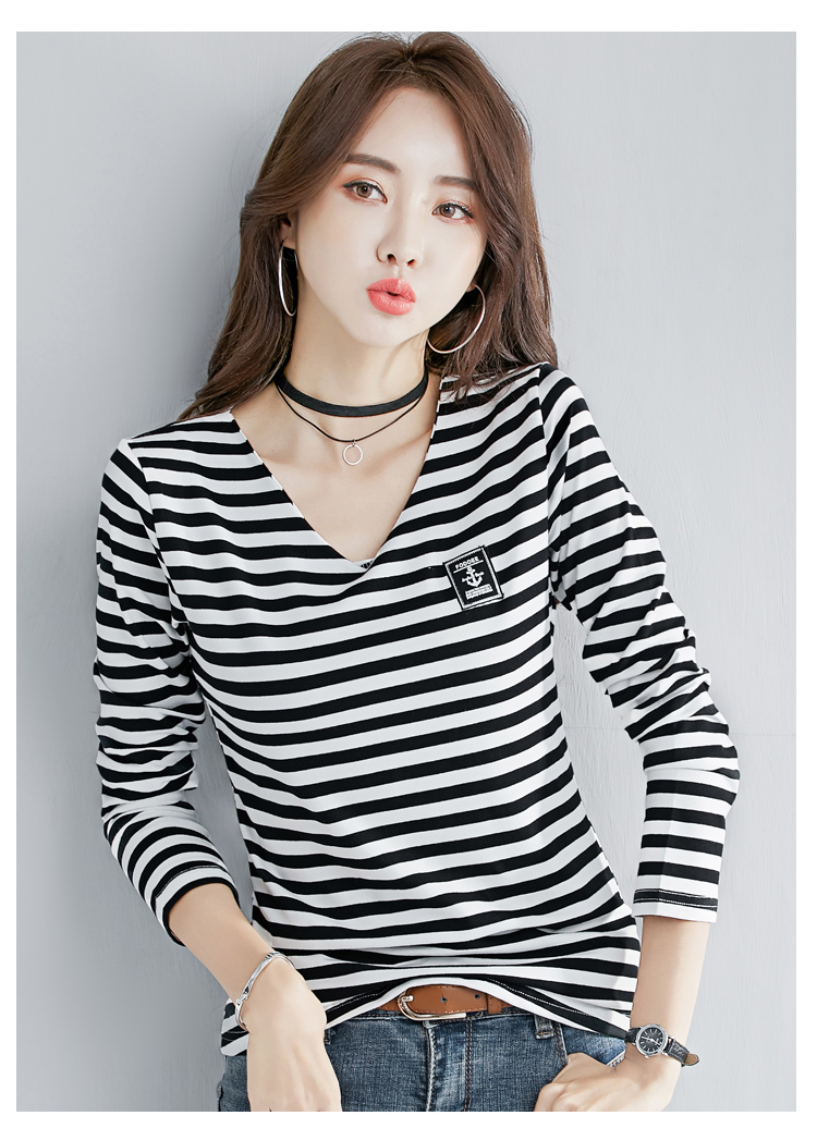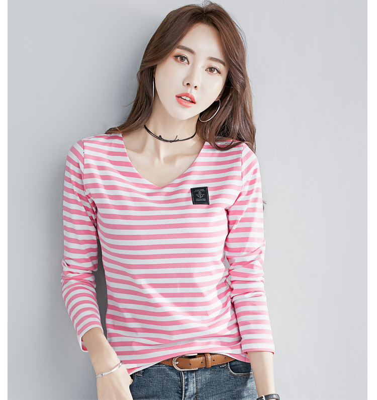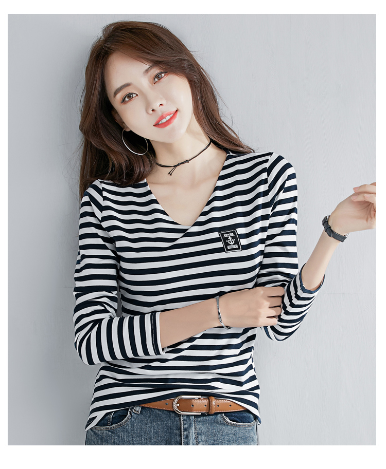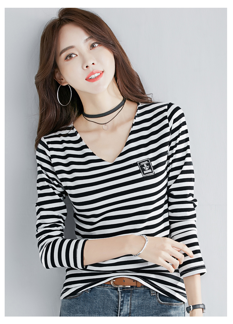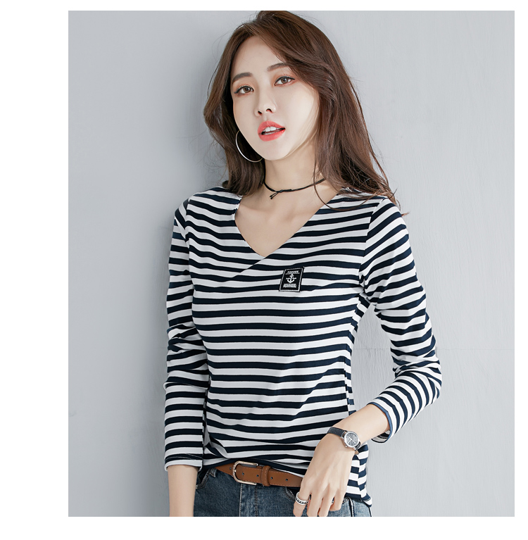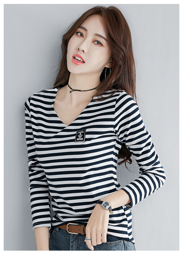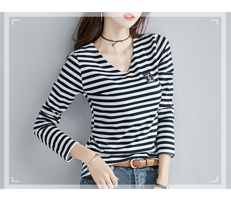 2019秋裝新款時尚打底衫女修身純棉上衣女V領條紋韓版百搭長袖t恤
