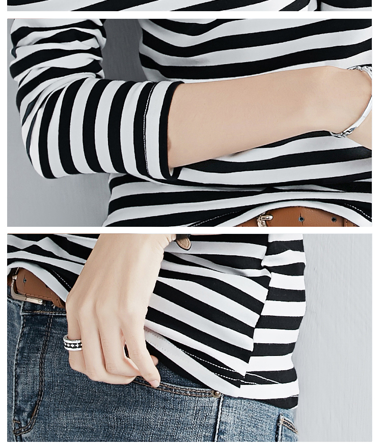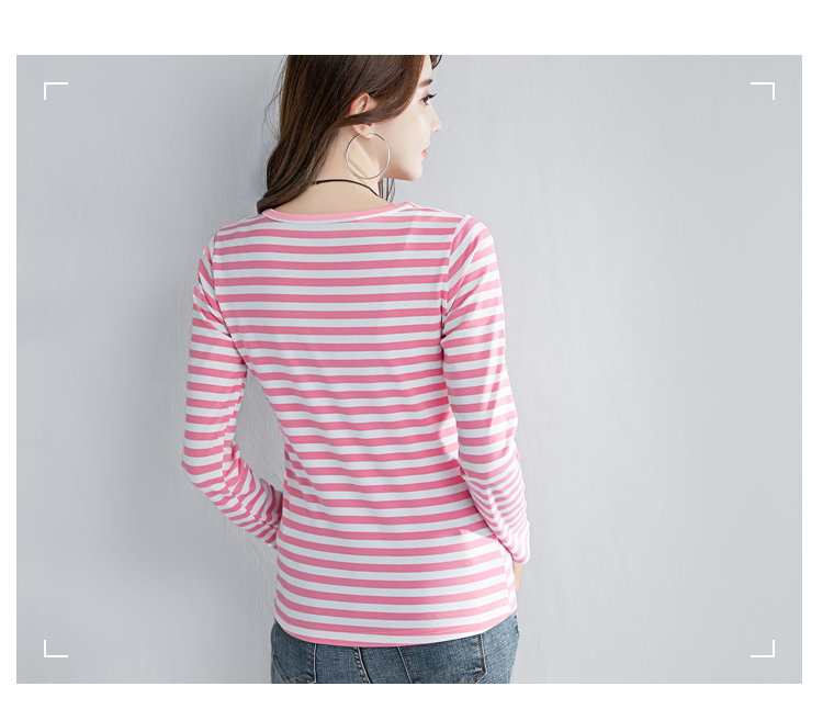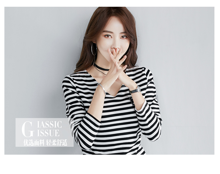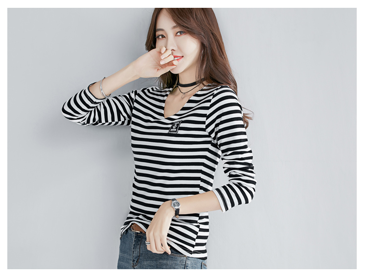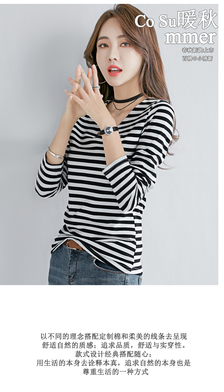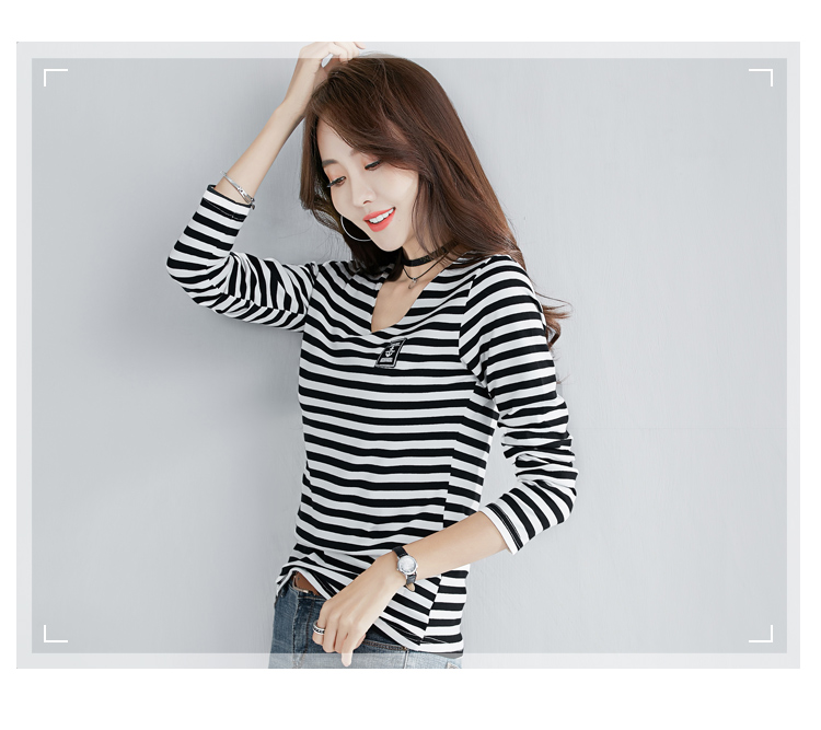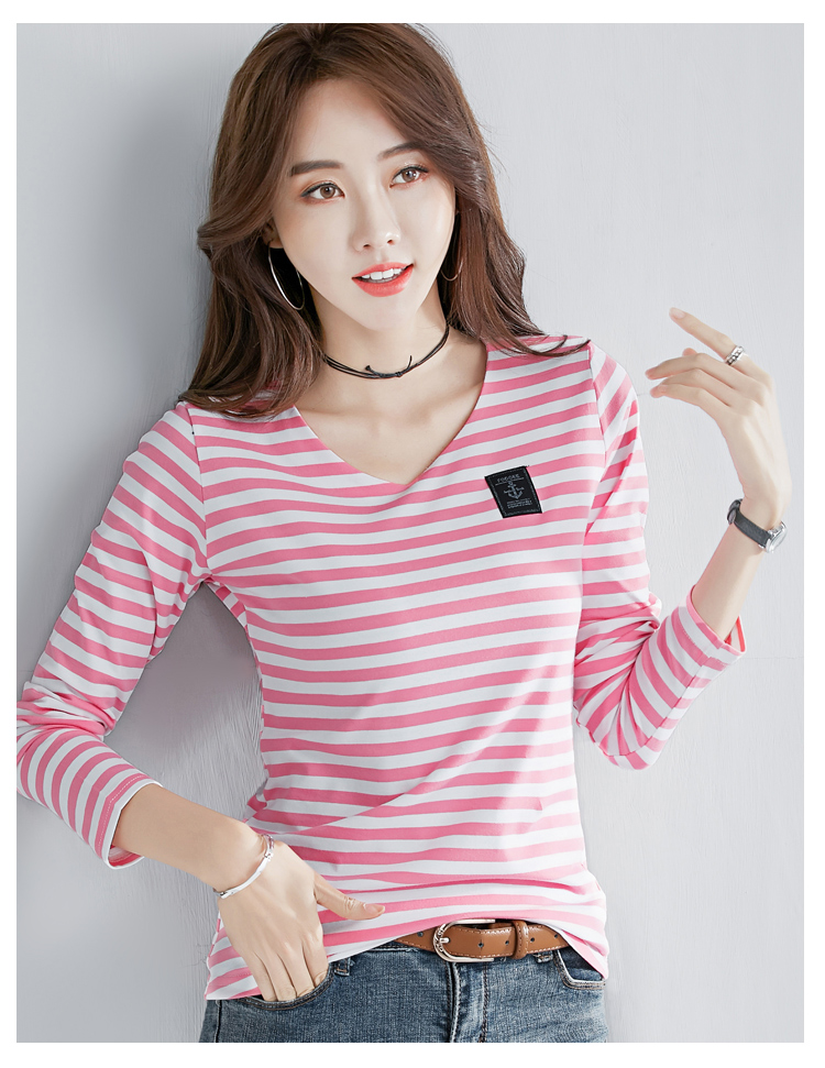 2019秋裝新款時尚打底衫女修身純棉上衣女V領條紋韓版百搭長袖t恤