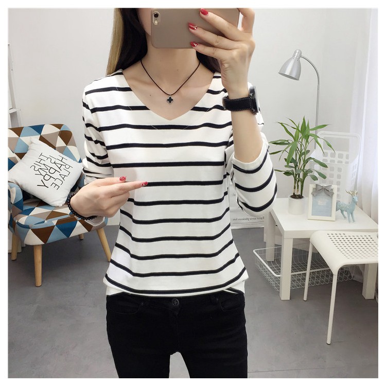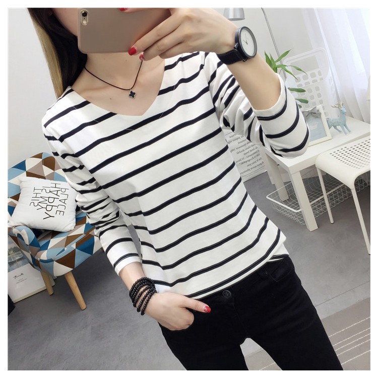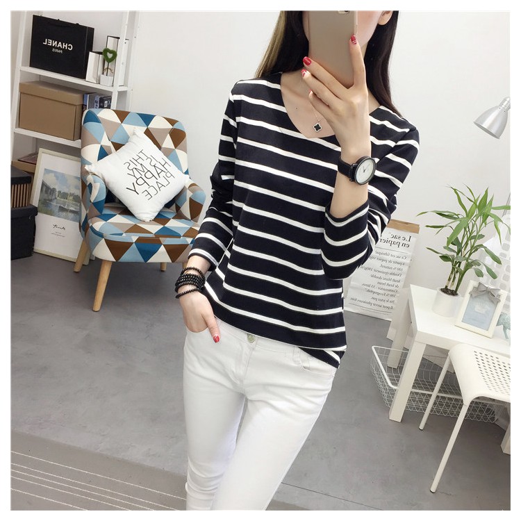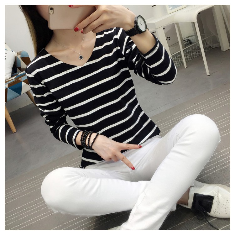 長袖t恤女條紋修身顯瘦純棉秋裝上衣2019新款韓版百搭內搭打底衫