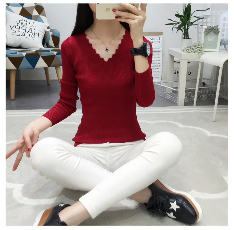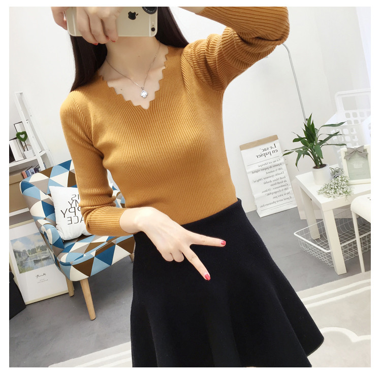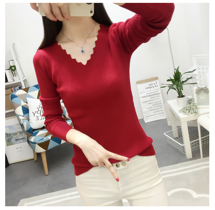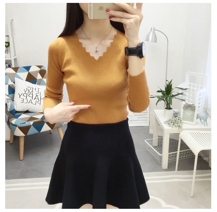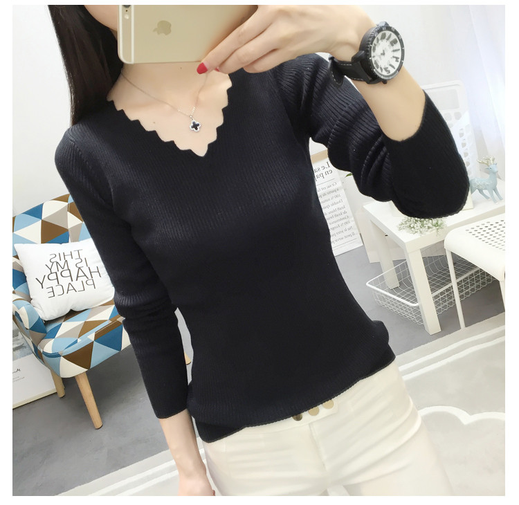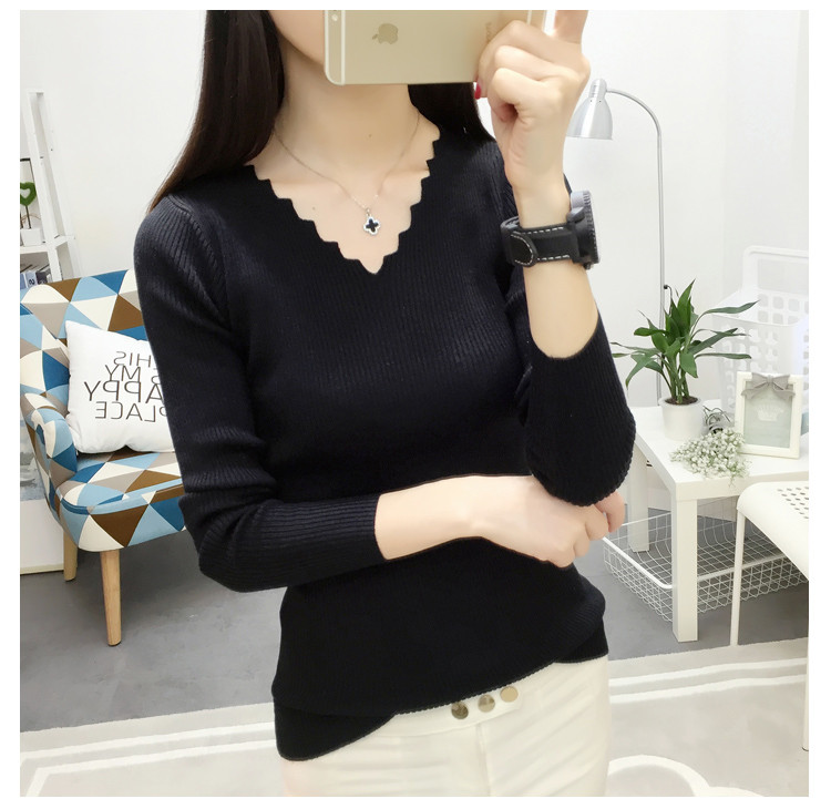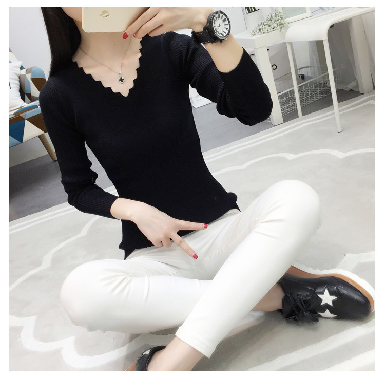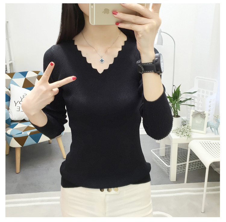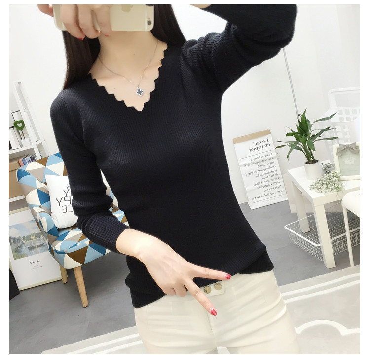 2019春季新款修身長袖V領打底針織衫韓版百搭套頭冬季毛衣女上衣