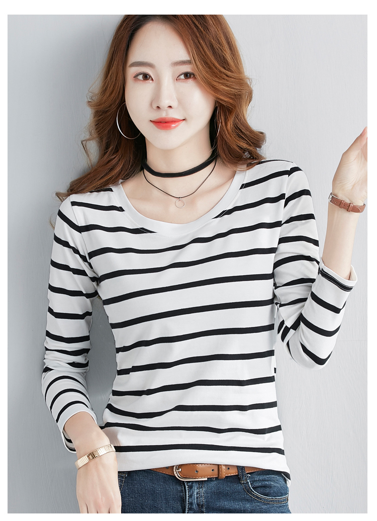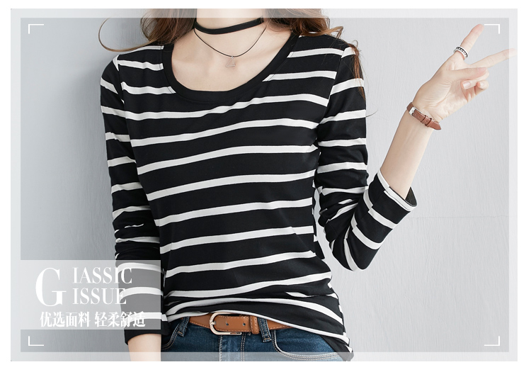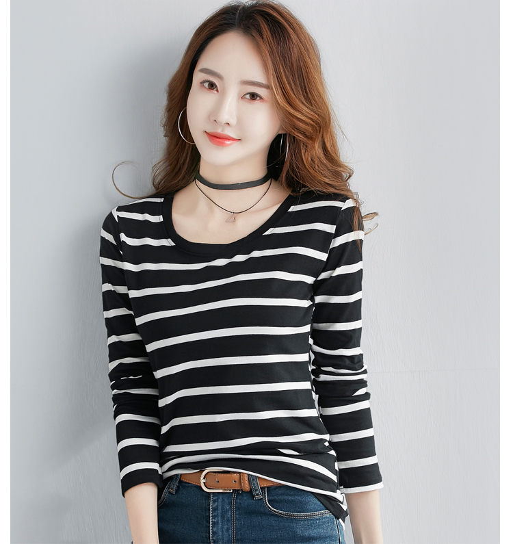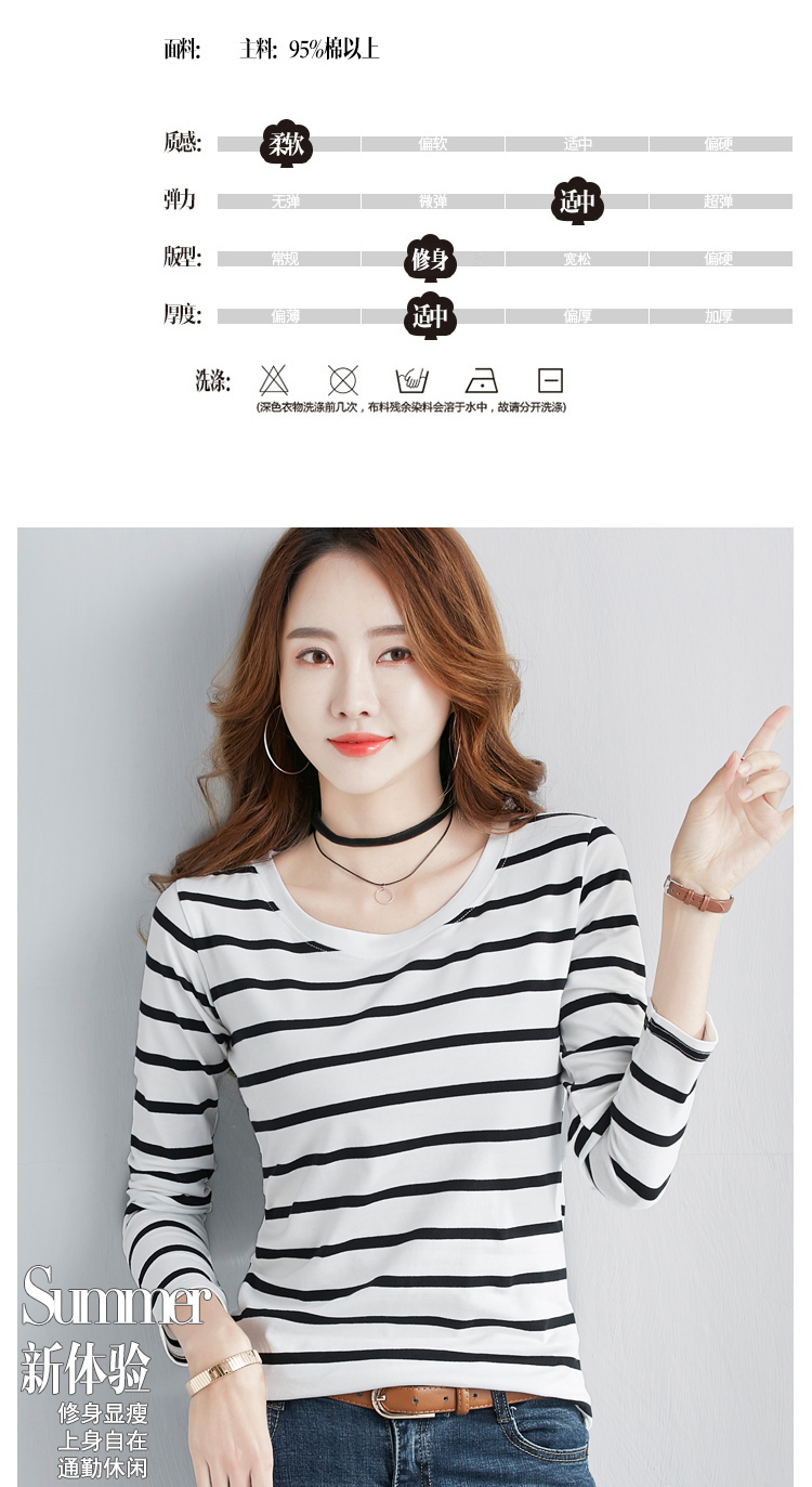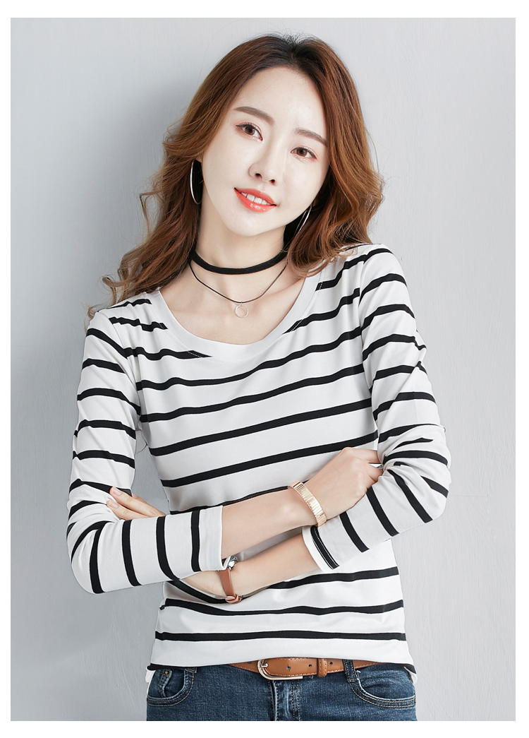 2019秋新款修身純棉上衣女韓版百搭長袖t恤圓領條紋時尚打底衫女