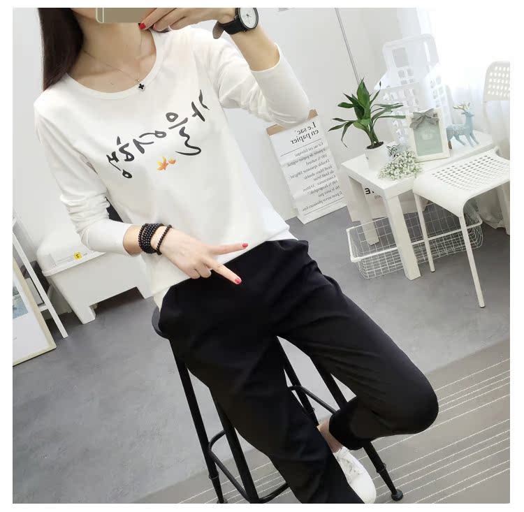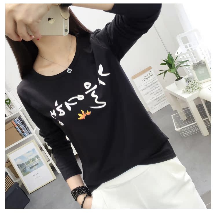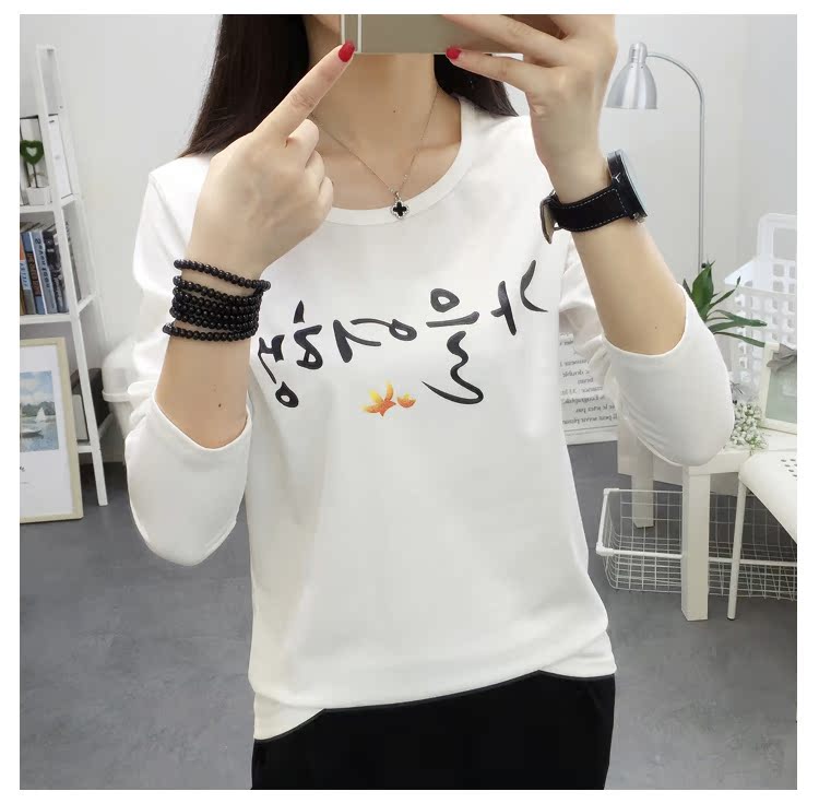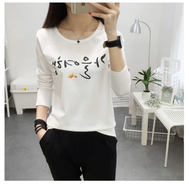 長袖t恤女白色寬松大碼顯瘦學生印花圓領韓版百搭學生上衣打底衫