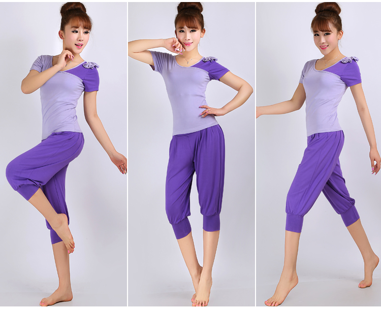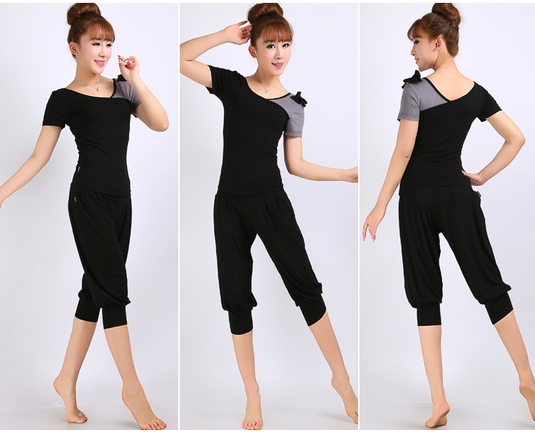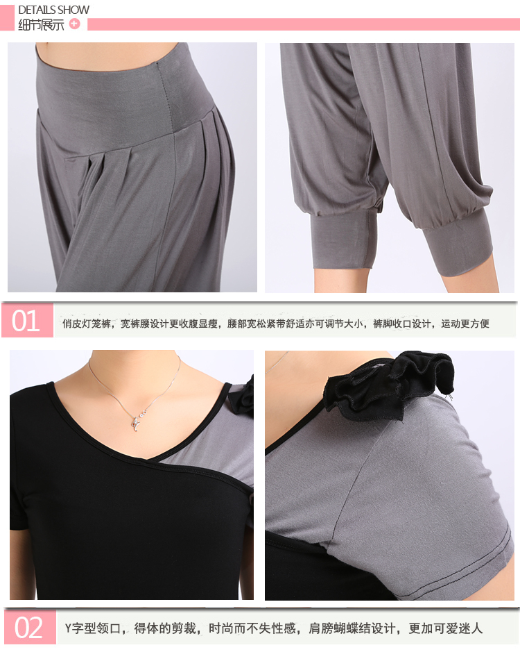 雙色+灰色M瑜伽服春夏裝莫代爾健身運動跑步顯瘦女士瑜珈短袖燈籠褲胸墊套裝