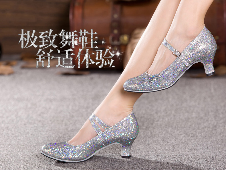 銀色室外膠底34拉丁舞鞋女式夏季成人 廣場舞蹈鞋中跟軟底交誼舞鞋紅色 亮片舞鞋