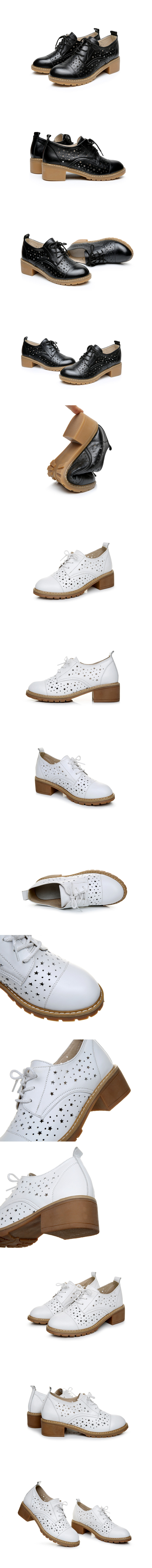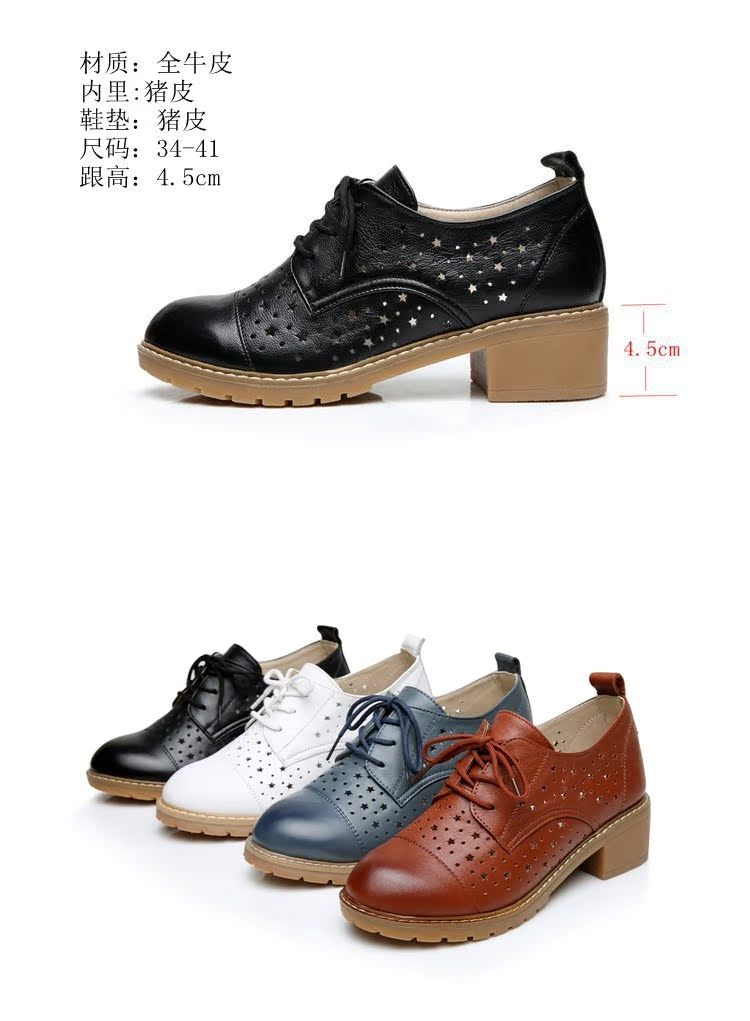 黑色34春夏新款真皮單鞋圓頭鏤空女鞋粗跟中跟休閑鞋深口系帶皮鞋娃娃鞋