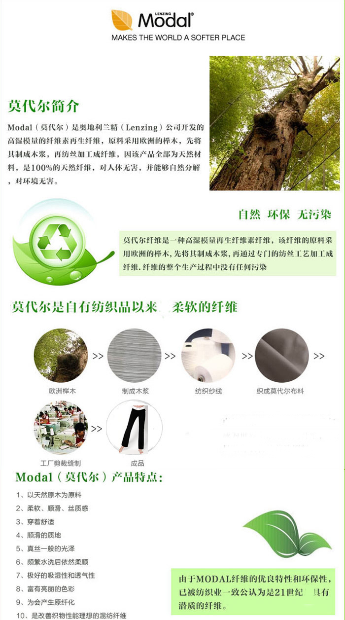 【關于莫代爾】:95%粘纖5%萊卡市面又稱為韓棉,絲光棉,拋光棉Modal纖維面料手感柔軟,懸垂性好,穿著舒適;吸濕性能、透氣性能優于純棉織物,是理想的貼身織物和保健服飾產品,有利于人體生理循環和健康;面料布面平整、細膩、光滑,具有天然真絲的效果;色澤艷麗、光量,是一種天然的絲光面料;性能穩定,越洗越柔軟,越洗越亮麗;成衣效果好,形態穩定性強,具有天然的抗皺性和免燙性,使穿著更加方便、自然