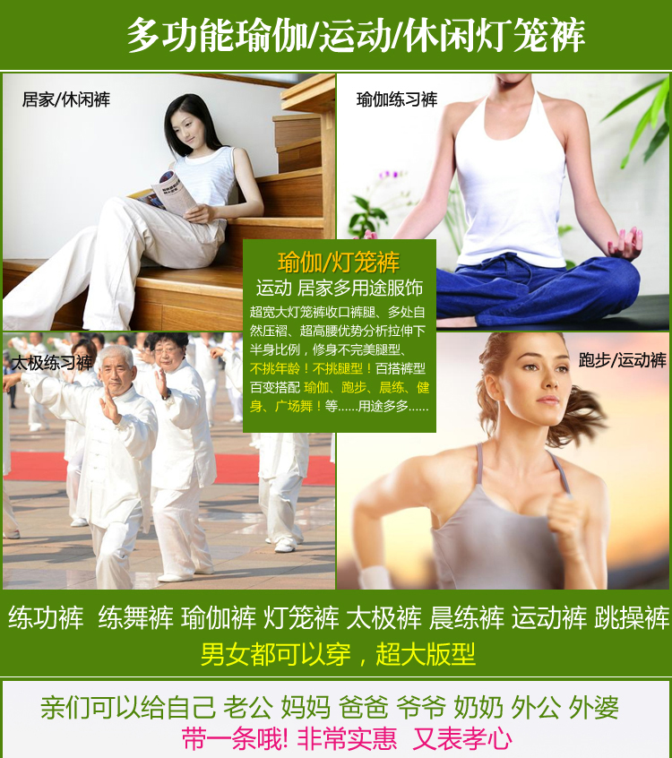 賣點:最新款燈籠式專業瑜伽褲。具有:輕、薄、軟、彈、垂的特點。專業環保面料具有非常好的彈性,拉伸力極強,適合完成各種動作。四季皆宜!瑜伽肚皮舞必備的一款褲子!練太極也很不錯哦! 如果您平時喜歡跳舞又喜歡瑜伽,一定要備上一條經典的V腰燈籠褲。這個KK無論是面料還是款式都是超贊的。可穿著的范圍也很大哦 |