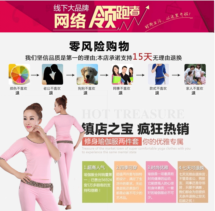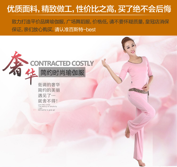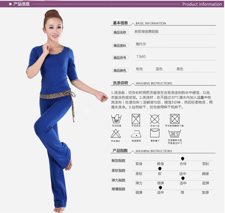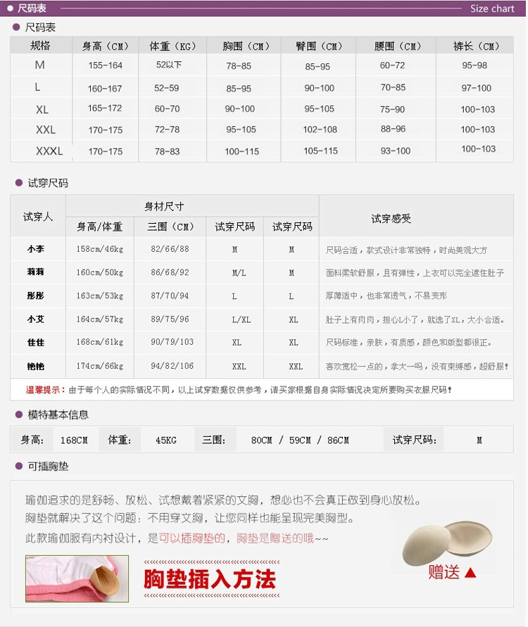 【編 號】:T840 【品 名】: 中袖瑜伽服套裝/健身服練功服 可插胸墊 【顏 色】: 三色可選 【質 地】:高檔莫代爾95%粘纖 5%氨綸萊卡不起球/不變形/不掉色 因這這個寶貝的面料彈力和復原性能非常好,適合各種身材,您選擇的尺碼稍在偏差也不要緊哦,莫代爾的優異彈力能夠彌補選擇的偏差而又不會太感緊繃。所以親們可以放心來拍!如果硬是放心不下,可以咨詢哦!我會熱情地接待 【使用范圍】:不僅可以在練習瑜珈時穿著,也適應于其它運動項目,這款并且還能在平時穿著休閑的時候穿喔,高跟鞋或者皮鞋涼鞋都可以的,非常的超值也非常的時尚,不論胖瘦的MM穿著效果都非常好。利用率和附加值很高的喔。 【建議選擇尺寸】: 適合:瑜伽、健美操、健身、拉丁、廣場舞等! 尺碼:M、L、XL、2XL 身高156-160厘米 體重105斤以下 建議穿M碼 注意,以上尺碼僅供參考,因為不是量身定做,每個人的身材存在個體差異,最終需要親們自己把握好穿什么碼,矮一點,豐一點的親建議大選一碼 |