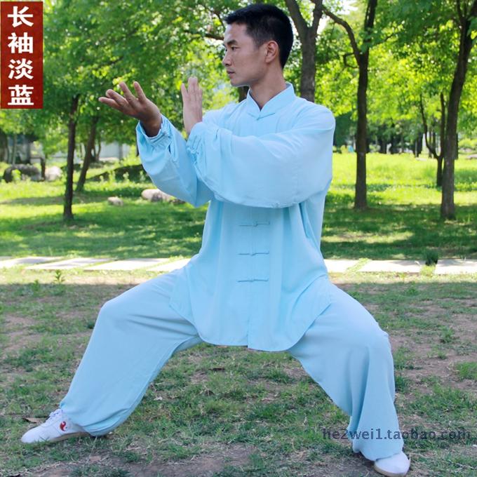 長袖淡藍色XS春秋晨練棉加絲太極服武術服裝長袖練功服 男女同款