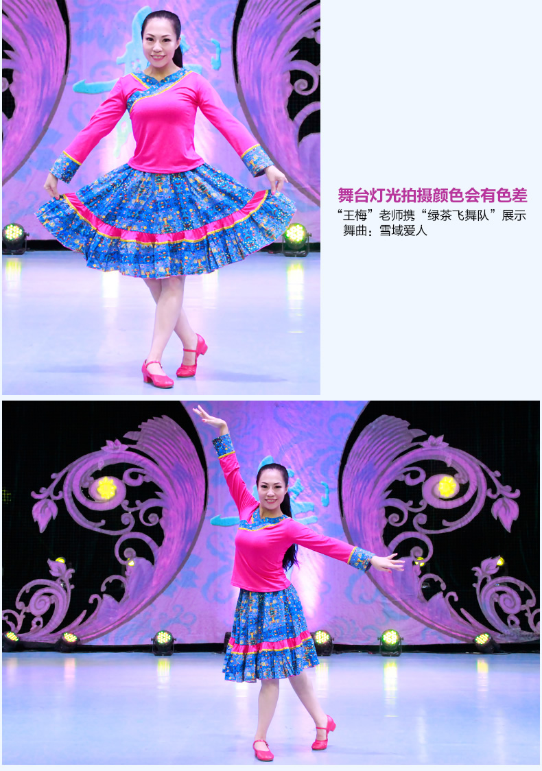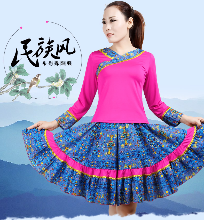 Z1022玫紅上衣+ Z2201藍花裙S芳之舞廣場舞服裝秋季新款藏族民族大擺裙上衣長袖套裝舞蹈服