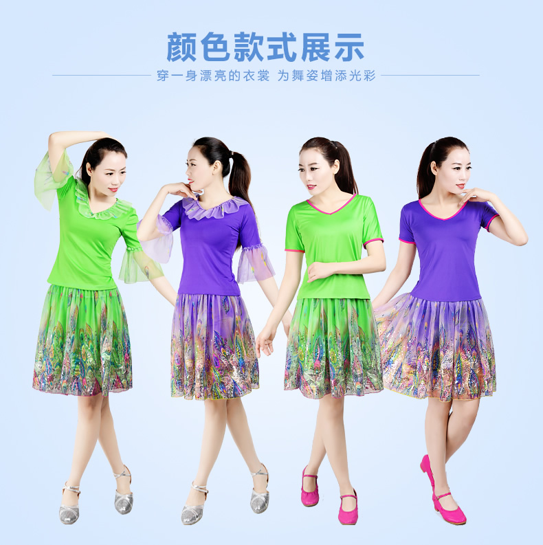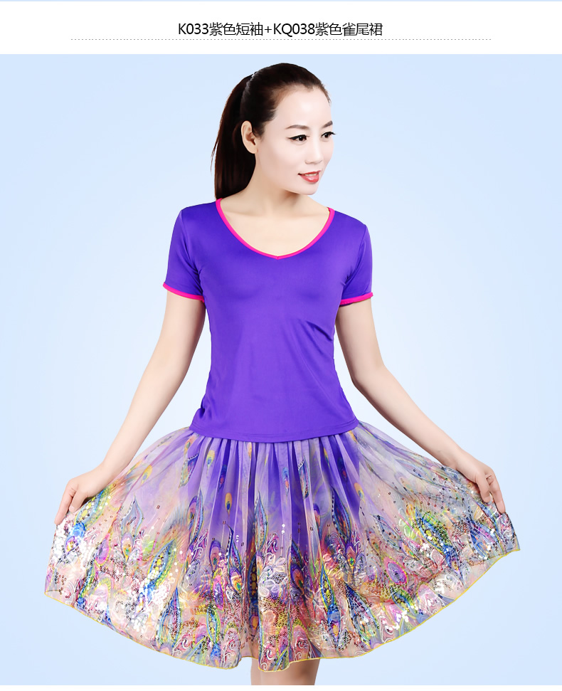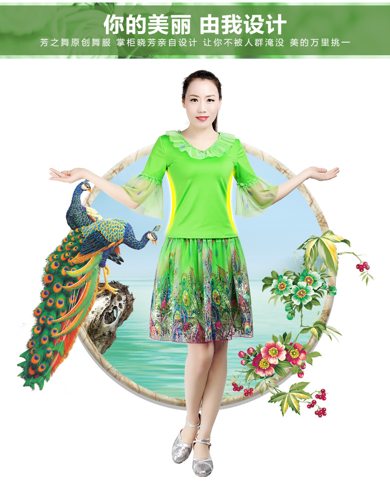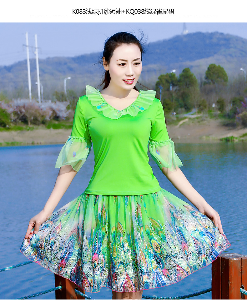 K083淺綠紗袖+KQ038淺綠雀尾裙S芳之舞2016夏季新款廣場舞服裝套裝短袖大擺裙子中老年跳舞表演服