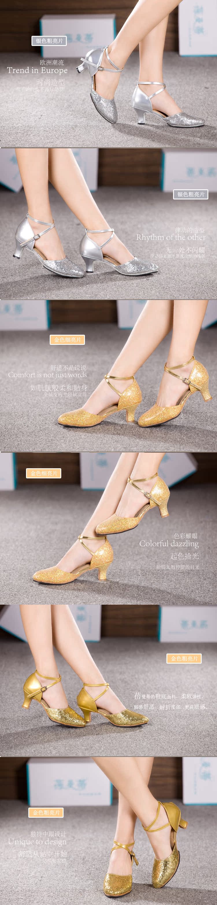 銀色粗亮片室內軟底33新款拉丁舞鞋女 成人中低跟交誼摩登舞鞋 銀色膠底廣場舞蹈鞋