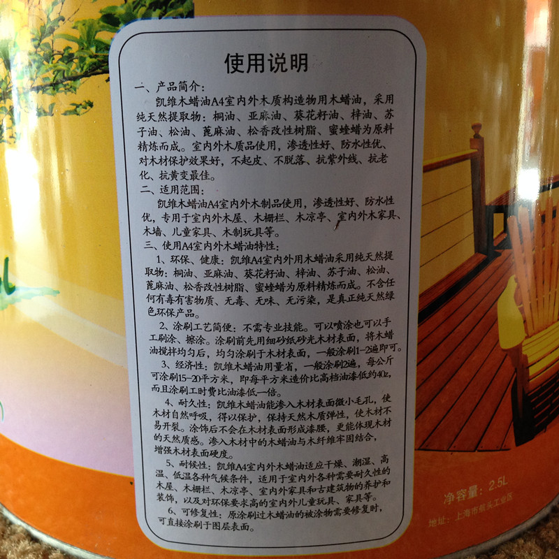 *滲透性和附著力特強,與木材持久結合,與傳統樹脂類涂料不同的是木材可以自由呼吸,隨氣候變化得到調節,可延緩變形,最大程度避免開裂。 *、抗靜電、防粉塵,保持木材本身紋理。施工簡單,易重涂、易維護。本品由植物提取液精制而成,不含甲醛、苯、二甲苯等有害物質,天然環保。經過CCA、ACQ等藥液處理過的防腐木材,在涂木油效果更佳。 適用范圍:戶外木質品,如木制房屋,花園地板、木門窗、花園家具、木涼亭、木籬笆木橋、木棧道、房頂木瓦片、木雕塑花架等。產品具有良好的耐候性,抗紫外線,、防潮、防霉,并可抵御海水的侵蝕,柔韌性強,附著力佳,防止木材變形,保持木材本身紋理,不易開裂、起皮和脫落等。 *施工溫度:15-30度最佳,避免烈日下施工。 *木材要求:含??啃∮?20%,表面干凈、打磨平整。 *施工形式:攪拌均勻后,刷、噴、滾、擦、均可以。 *施工方法:先薄薄地涂上一層,均勻涂刷,不要積油。實干后再涂一層即可。質地堅硬吸收不好的木材宜用布均勻涂擦。 *施工面積:理論上1000ML木油可涂刷表面積為10-15平方米的木材一遍。木材吸收率不同可導致用油量不等。 *干燥時間:一般20度情況下在24小時內實干,木材表面原因、施工環境不同可能導致干燥延長。 *自我保護:避免皮膚接觸,若不小心接觸,立即用肥皂水清洗;若滴入眼睛,先用清水清洗,在去醫院處理。擦涂時戴上塑料手套。 *垃圾處理:開罐后盡快用完,若有少量剩余待干燥后做一般的垃圾處理。 *本品保存:陰涼處保存,謹防兒童接觸,遠離火源!!! 本產品為無色清水漆,若需要顏色請與店主聯系,本店提供專用色漿,每瓶15,每瓶色漿可搭配一桶木油2.5L