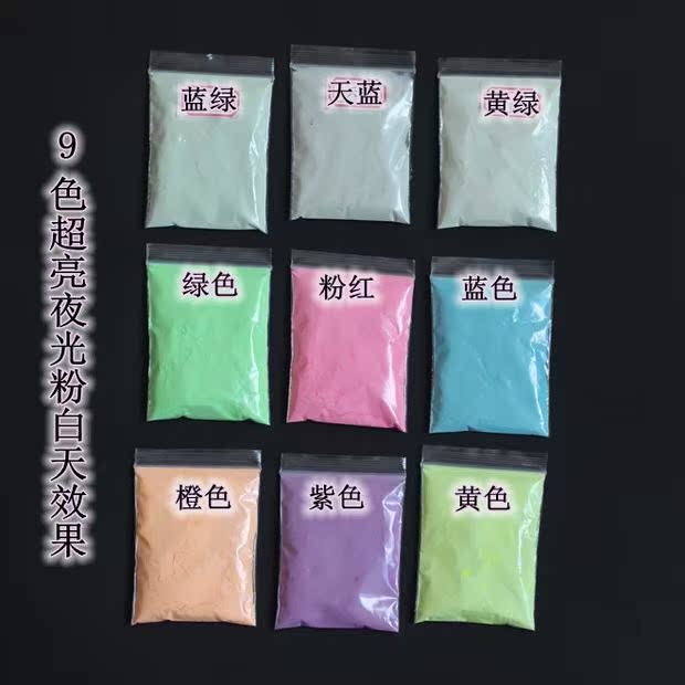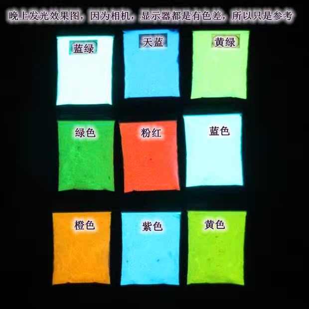 夜光粉三原色黃綠色、藍綠色、天藍色其他顏色的夜光粉是用黃綠色或者藍綠色粉配的,所以發光都是有點偏黃或者綠的,全行業都是這樣的,顏色都有點色差的,介意者慎拍!