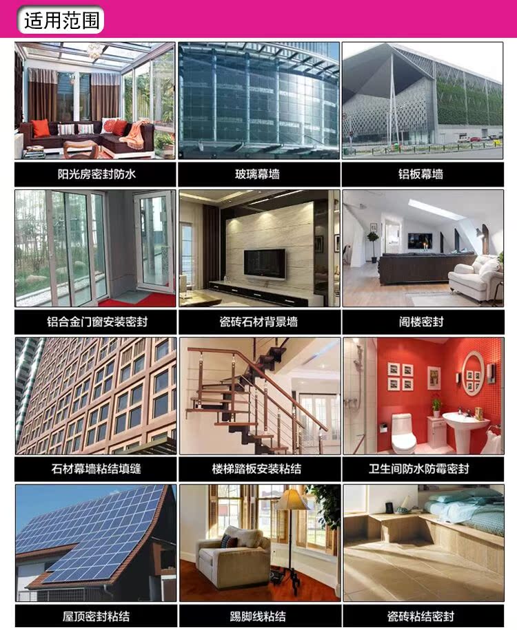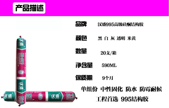 1.漢盛HS-995硅酮構密封膠系單組份、中性、室溫固化、高模量,建筑結構用硅酮密封膠,對玻璃、鋁材、鋼材等無腐蝕性。2. 優異的耐臭氧、耐紫外線、耐氣候老化性能、長久的使用壽命。3. 拉伸粘結強度高,對大部分建筑材料具有優良的粘結性能。4. 對中性硅酮膠、耐候膠有良好的相容性。