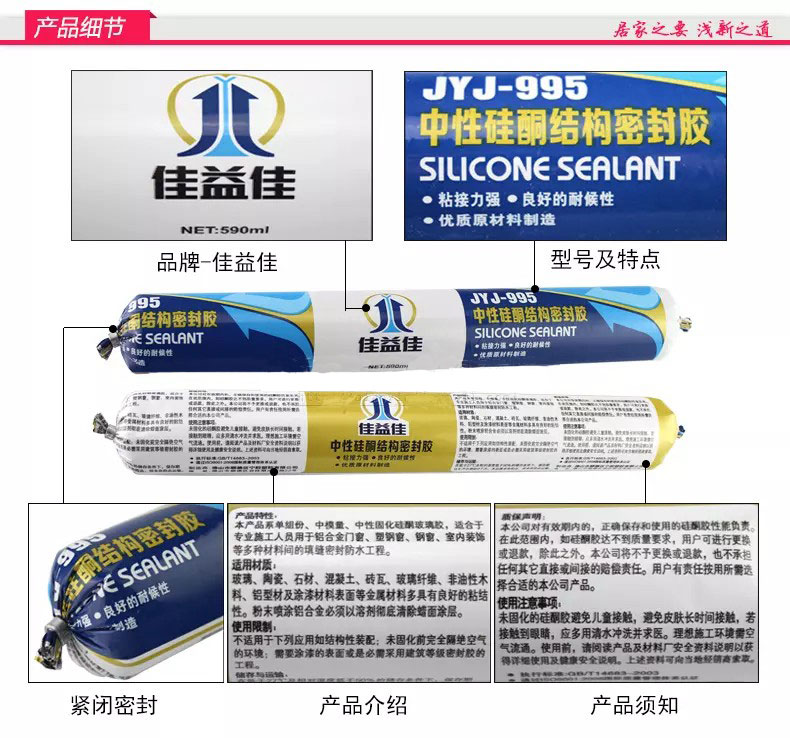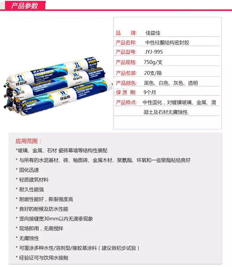 佳益佳995結構膠:◆中性固化,對鍍鏌玻璃、金屬、混凝土及石材無腐蝕性,可以粘貼瓷磚、馬賽克、鋁塑板等;◆良好的使用性能,于廣泛的氣溫下均可施工及具有優異的粘結性;◆優異的耐高低溫、耐紫外線、耐氣溫老化及耐臭氧性能;◆對其他中性硅酮密封膠有良好的相容性。