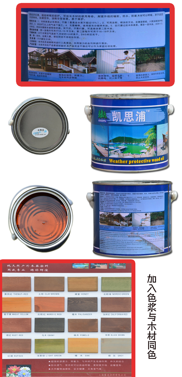 使用用量:1桶2.5L的正常可以刷15-20平方2遍具體還要根據木頭的吸油量。 使用方法:一般用羊毛刷刷木油 不能來回刷,刷的時候要朝一個方向刷,一般木油刷2遍-3遍,刷了一遍后一定要等第一遍干了以后再刷第二遍以此類推。 支持正品 杜絕假冒! 溫馨提示: 1:淘友們在您收到快遞時請確保包裝完好無損,如有破損請當場與本公司聯系,聯系:2:本品為透明紅色清油干后透明無色,如需調色請木/蠟油專用色漿調色,具體顏色可參照以上色卡! 3:色漿每瓶可調2.5L木油一桶,可根據自己的喜好加深加淺,色漿使用前請將色漿用力搖勻,倒入木油中攪拌均勻后再涂刷! 特性與使用: *滲透性和附著力特強,與木材持久結合,與傳統樹脂類涂料不同的是木材可以自 由呼吸,隨氣候變化得到調節,可延緩變形,最大程度避免開裂。 *、抗靜電、防粉塵,保持木材本身紋理。施工簡單,?字贗俊?孜??1酒? 由植物提取液精制而成,不含甲醛、苯、二甲苯等有害物質,天然環保。經過CCA 、ACQ等藥液處理過的防腐木材,在涂木油效果更佳。 *施工溫度:15-30度最佳,避免烈日下施工。 *木材要求:含水量小于20%,表面干凈、打磨平整。 *施工形式:攪拌均勻后,刷、噴、滾、擦、均可以。 *施工方法:先薄薄地涂上一層,均勻涂刷,不要積油。實干后再涂一層即可。質 地堅硬吸收不好的木材宜用布均勻涂擦。 *施工面積:理論上1000ML木油可涂刷表面積??10-15平方?椎哪靜模ㄒ槐椋?D? 材吸收率不同可導致用油量不等。 *干燥時間:一般20度情況下在24小時內實干,木材表面原因、施工環境不同可能 導致干燥延長。 *自我保護:避免皮膚接觸,若不小心接觸,立即用肥皂水清洗;若滴入眼睛,先 用清水清洗,在去醫院處理。擦涂時戴上塑料手套。 *垃圾處理:開罐后盡快用完,若有少量剩余待干燥后做一般的垃圾處理?? *本品保存:陰涼處保存,謹防兒童接觸,遠離火源!!! 買家需知: 本產品為無色清水漆,若需要顏色請與店主聯系,本店提供專用色漿,每瓶15 ,每瓶色漿可搭配2.5升木油。 ?.顏色請參考色卡. ?.本店鄭重承諾:本店所有木油是真正廠家原裝正品,二級經銷商價格. ?.一箱4桶以上, 注意:本品一桶連2.2公斤左右。 量大可以通過物流,可以優惠! |