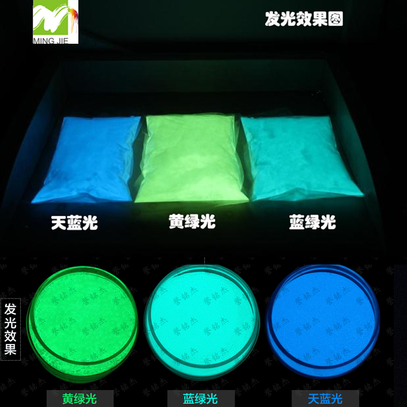 | 本公司大部分商品6一10天到貨。不接急單。急單的客戶請不要下單。感謝諒解與合作! 超亮長效夜光粉 稀土材料環保夜光顏料 彩色夜光粉 1公斤包裝 我司夜光粉為廠家直銷產品,可用于絲網印刷,工藝品噴涂,調制夜光漆熒光漆,塑膠注塑等價格優惠,量大可批發,批發客戶請聯系:黃小姐 :1198204942 一,夜光粉產品特性: 譽銘杰超長余輝光致蓄光發光材料---夜光粉,在吸收可見光15-30分鐘后,于暗處可持續發光10小時以上,發光效果好,亮度高,時間長。 不含任何放射性物質,無毒,無害,不燃燒,不含磷,鉛和其它有害無素或化學品,對人體安全,通過國家權威檢測部門的檢測。 具有穩定的物理和化學屬性。 使用壽命可達10年以上。 微小顆粒,易于同各種透明介質原料混合使用。 二、【產品顏色】 顏色有13種可以任選,分別為黃綠、藍綠、天藍、紫光、綠色、檸檬黃、藍色、粉紅、橙紅、橙黃、橙色、玫瑰紅、大紅發光亮度黃綠,藍綠,天藍最亮其它彩色的發光效果要弱些 三、【夜光粉注意事項】 A、余輝亮度的測試是以d65標準光源,1000lx激發5min所得的數值; C、產品外觀顏色和發光顏色均以樣品為準。