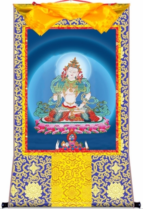 因是佛教圣相,所以我們選用的裝裱材料均是現在能有的最好的裝裱材料,正面選用定制的高檔棉織金絲錦緞很多仿制的是化纖材料,織繡藏傳佛教的富貴蓮花圖案,背面使用加厚仿真絲黃色綢緞布,手工精細裝裱而成,帶掛軸,照面,可直接懸掛到墻上。