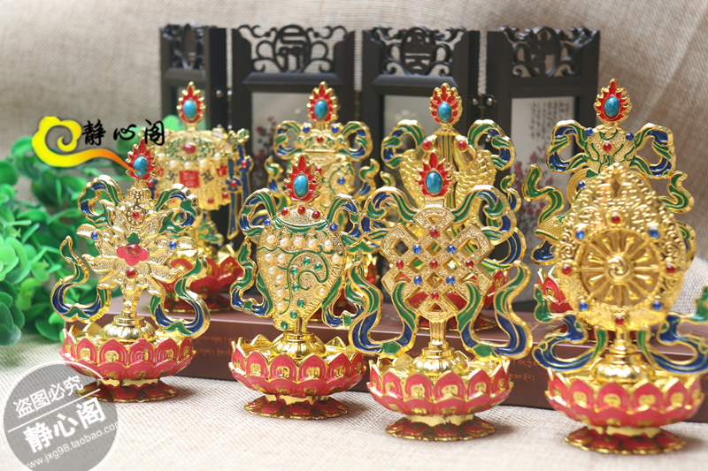| 本公司大部分商品6一10天到貨。不接急單。急單的客戶請不要下單。感謝諒解與合作! 【名 稱】蓮花座八吉祥 吉祥八寶擺件 【材 質】銅合金 【規 格】高約10cm ,上寬約5cm,底部寬約5.5cm 【顏 色】金色 彩繪 【重量】單個重145g 八吉祥,又稱佛教八寶,象征佛教威力的八種物象。由八種識智即眼、耳、鼻、音、心、身、意、藏所感悟顯現。描繪成八種圖案紋飾。作為佛教藝術的裝飾。八吉祥簡稱輪、螺、傘、蓋、花、罐、魚、長。 1.輪為法輪,即佛法的代稱。指佛法具有傳之久遠的法力,輾轉相傳弘揚光大。 2.螺為佛事活動使用的樂器之一,又稱梵貝。八吉祥組合,以法螺之形,象征佛法所傳之法音,妙音吉祥響徹世間。 3.傘即寶傘,喻佛法運轉傳播張弛自如,貫通無礙。 4.蓋即白蓋,形容佛法如神圣的華蓋,遍覆三千大千世界,廣施慈悲,普惠眾生。 5.花為蓮花,曉喻佛法圣潔,如蓮之清新芳蕙,以沁心馨香,引導眾生脫離污垢。 6.罐原為寶瓶,喻佛法深厚堅強,聚福智圓充足,如寶瓶般無散無漏。 7.魚,形以金魚,喻佛法具有無限生機,如魚游水中,自由自在。解脫劫難,游刃自如。 8.長指盤長,又稱無窮盤、幸運結。喻佛法的強大生命力,如無窮盤結樣延綿往還,長承久傳,無盡無休。 ![]() ![]() ![]() ![]() ![]() ![]() |