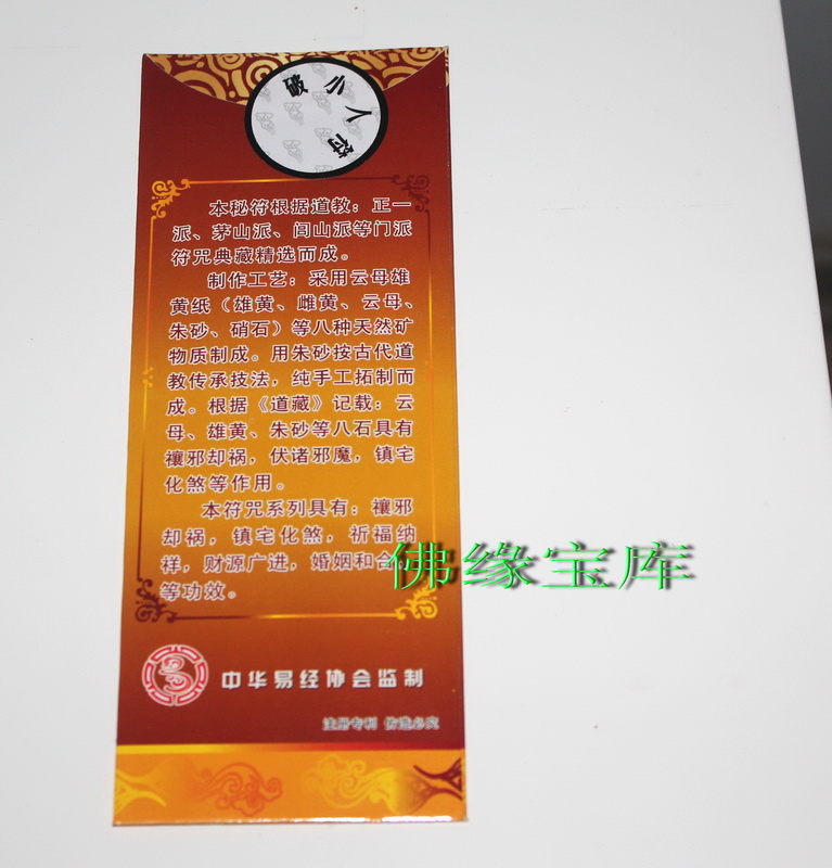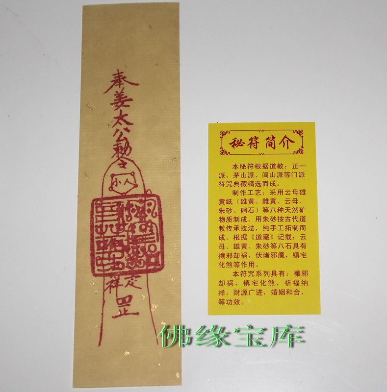 | 本公司大部分商品6一10天到貨。不接急單。急單的客戶請不要下單。感謝諒解與合作! 【商品名稱】破小人符 【商品尺寸】寬4CM高15.8CM 本秘符根據道教:正一派、茅山派、閭山派等門派符咒典藏精選而成。 制作工藝:采用云母雄黃紙雄黃、雌黃、云母、朱砂、硝石等八種天然礦物質制成。用朱砂按古代道教傳承技法,純手工拓制而成。根據《道藏》記載:云母、雄黃、朱砂等八石具有禳邪卻禍,伏諸邪魔,鎮宅化煞等作用。