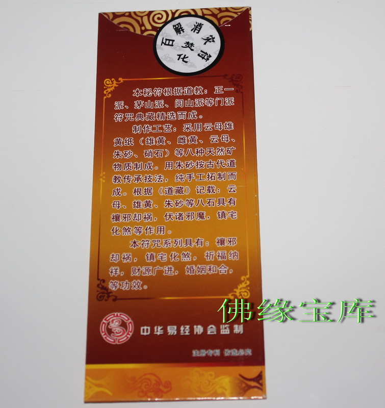 | 本公司大部分商品6一10天到貨。不接急單。急單的客戶請不要下單。感謝諒解與合作! 【商品名稱】百解消災符符 【商品尺寸】寬4CM高15.8CM 本符咒由道教高光開光,一符在手,百難全消。 本秘符根據道教:正一派、茅山派、閭山派等門派符咒典藏精選而成。 制作工藝:采用云母雄黃紙雄黃、雌黃、云母、朱砂、硝石等八種天然礦物質制成。用朱砂按古代道教傳承技法,純手工拓制而成。根據《道藏》記載:云母、雄黃、朱砂等八石具有禳邪卻禍,伏諸邪魔,鎮宅化煞等作用。