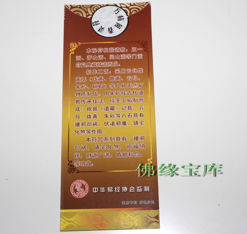| 本公司大部分商品6一10天到貨。不接急單。急單的客戶請不要下單。感謝諒解與合作! 【商品名稱】萬病回春符 【商品尺寸】寬4CM高15.8CM 本符咒由道教高光開光,有助于驅除萬病,身體健康。 本秘符根據道教:正一派、茅山派、閭山派等門派符咒典藏精選而成。 制作工藝:采用云母雄黃紙雄黃、雌黃、云母、朱砂、硝石等八種天然礦物質制成。用朱砂按古代道教傳承技法,純手工拓制而成。根據《道藏》記載:云母、雄黃、朱砂等八石具有禳邪卻禍,伏諸邪魔,鎮宅化煞等作用。