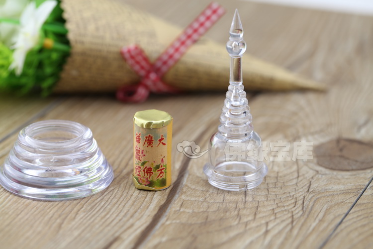 | 本公司大部分商品6一10天到貨。不接急單。急單的客戶請不要下單。感謝諒解與合作! 【商品名稱】開光亞克力舍利塔 【商品材質】亞克力 【商品尺寸】高9厘米 直徑4.5厘米 經文可選:地藏經,大方華佛嚴經,寶篋印陀羅尼經,大悲咒,楞嚴咒,無垢凈光大陀羅尼經,拍時請備注。
