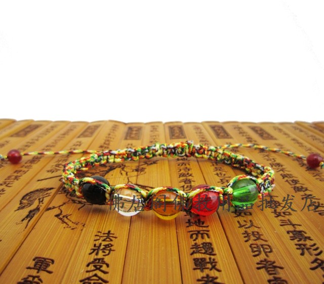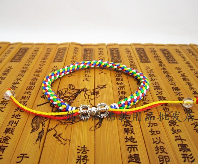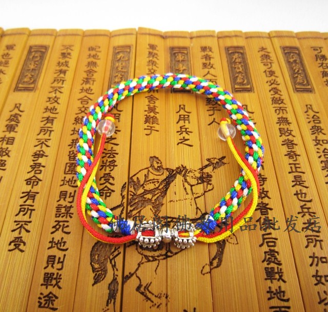 五色分表代表金、木、水、火、土五行以及東、西、南、北、中五方。 象徵五種法門:信、進、念、定、慧; 在佛經中,五色線也代表著金剛界的五佛西方阿彌陀佛。南方寶生佛、北方不空成就佛、東方阿阿閃佛、中央大日如來佛。 身戴五色線,可得五方大佛的護身符,可成就人世間的智慧、健康、富貴、快樂、功名。。。一切俗愿所求。 佛教五色的五位財神.本款五色線以黃色為底,映襯其他四色.主要代表黃財神. 黃財神,藏名藏拉色波,是密教之護法神祗,諸財神之首。黃財神是藏傳佛教各大教派普遍供養的五姓財神之一,因其身相黃色,故稱為黃財神。黃財神主司財富,能使一切眾生脫離一切貧困、災難,增長一切善法、財富,富饒自在。其功德:能增長富德、壽命、智慧、物質及精神上之受用。 而傳統道教的說法,五色則分別代表:木、火、土、金、水五行,以及東、西、南、北、中五方. |