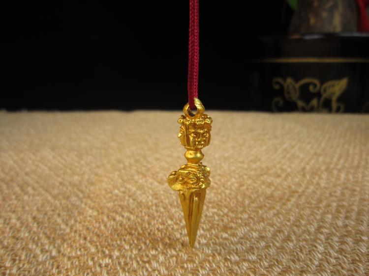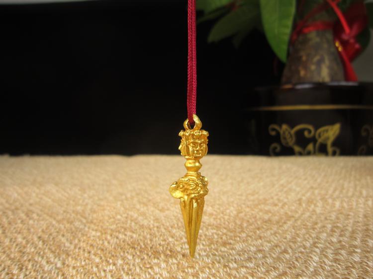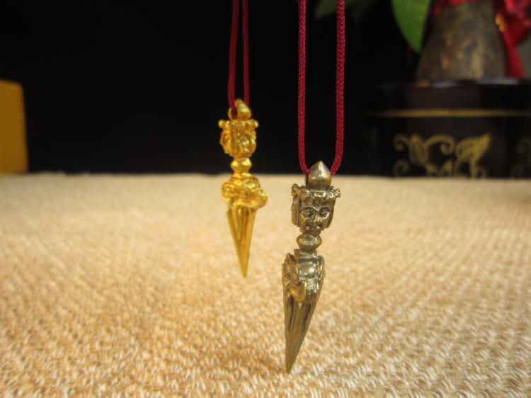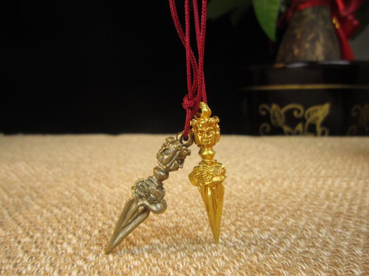 【普巴金剛】 “普”字表空性之義,“巴”字表智慧,普巴即空性與智慧結合成不二體性。普巴法的修持,在于斷除一切自我之貪執,消除內心之恐懼,如此,才能了解法界性,亦即不在于降伏外在之物,而是在于對自己內心本性的了悟。 藏人傳說,古時有一大力鬼神「麻當魯扎」具三頭六臂四族二翅,住于尸陀林中,危害三界有情。 噶瑪黑魯嘎金剛薩埵的忿怒相 ,為降伏此大力鬼神,乃化身為「普巴金剛」,與此大力鬼神同一形相,具大威神力,終將大力鬼神及一切魔眾摧伏。 本尊身黑藍色,具有三頭、三目、六手,背后生雙翼,如劍銳利,頸掛三串人首發,面涂三色,表三毒清凈,頭戴五骷冠,表示以五方佛的智慧作頭上裝飾,身披象皮 - 表降伏愚癡、人皮 - 表降伏貪愛,若虎皮裙 - 表降伏嗔恨。 右二足踏男魔之背,左二足踏女魔之胸,表降服四魔,安住于般若智焰之中。 頸上蛇飾表本尊具足降伏龍族,能統治一切之威力。右頭白色表文殊菩薩的忿怒相 - 大威德金剛,為諸佛身的代表。 左頭紅色表阿彌陀佛或觀音菩薩的忿怒相 - 馬頭明王,為諸佛語的代表。 中間藍色表大勢至菩薩的忿怒相 - 金剛手菩薩,為諸佛意的代表。 具有六手,右第一手執天鐵制九股金剛杵鐵表忿怒,九股表三界九乘一切眾生。 右第二手執金制五股金剛杵金表喜樂,五股表轉五毒成五智。 左第一手執般若智焰表燃燒一切苦惱。 左第二手執三叉戢藏名 : 卡章嘎,表盡攝三界空行母。 原二合掌捧單面金剛橛表凈除一切煩惱魔障。 原二合掌捧單面金剛橛表凈除一切煩惱魔障。佛母名洛格津母,身淺藍,右執鄔婆羅華亦有傳承持天杖者,左擎盈血顱器,五手印飾,腰系豹皮裙,與父佛現雙運大樂相。 普巴金剛含義 是寧瑪巴修部八大法行中的一尊。八大法行中有文殊身,而諸佛身之壇城皆集于文殊身現忿怒相,忿怒文殊就是大威德金剛。大威德金剛能滅除死主,將一切障礙清除。一切諸佛之身都集于大威德金剛身。一切諸佛之語都聚集于馬頭明王的壇城中。一切諸佛之意都聚集于揚大本尊上。一切諸佛之功德都聚集在甘露漩明王的壇城中。而一切諸佛的事業完全聚集在普巴金剛的壇城中。 只要對普巴金剛深具信心,觀修普巴金剛,向普巴金剛祈請,現前這一世能獲得八勝德,即吉祥、長壽、無病、有權、有勢、富有、聞名等。如能具信心、如法精進修持普巴金剛,就能獲得究竟普巴金剛的成就。普巴金剛的壇城是諸佛的總相,三寶的總集。顯教佛、法、僧三寶,密教上師、本尊、空行內三寶,大乘法身、報身、化身密三寶,普巴金剛壇城無一不具足,要是能成就普巴金剛,就等于成就一切三寶。 【特別說明】 此款降魔杵為純手工打造。從尼泊爾帶回。因為中尼封關的緣故,尼泊爾產宗教用品禁止通過官方渠道進入中國,故純正尼泊爾佛具的價格日益飆漲,希望有緣的師兄不要錯過。 【關于金剛杵】 “金剛杵”一詞,原本是帝釋的一種“電光”的稱呼。不過,平常都用于稱謂祂所用的武器。同時對于諸神力士所持用的一種器仗,也稱作“金剛杵”。在后來的密教中,采取它寓有“摧毀敵者”的間意義,遂把諸尊圣神所執持的某些器仗,都稱呼為“金剛杵”了。從而更把它轉變為修法用的道具。 有關“金剛杵”的敘述,在契經中,時常提到它。例如:菩提場所說一字頂輪王經第一、大般涅槃經第三、陀羅尼集經、蘇婆呼童子請問經、一切如來大秘密王未曾有最上微妙大曼荼“荼”字有作“陀”、“拿”的羅經……,都曾經提到“金剛杵”的情形。