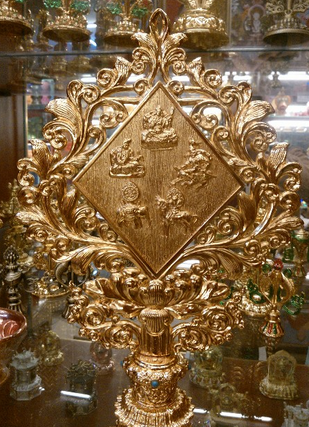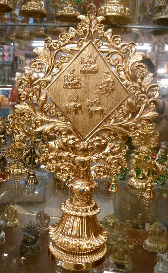 | 本公司大部分商品6一10天到貨。不接急單。急單的客戶請不要下單。感謝諒解與合作! 商品描述 商品名稱:七政寶組合擺件特大號 ![]() ![]() 七珍與八寶 一七珍 七珍,又稱七寶,即七種珍奇寶物。藏傳佛教供奉的七珍在《翻譯名義集》卷三云:“佛教七寶凡有二種,一者七種珍寶,二者七種王寶。”王寶為另一種涵意的七珍,是轉輪圣王擁有的七珍,它們是:金輪寶、主藏寶、大臣寶、玉女寶、白象寶、勝馬寶、將軍寶七種。 1.金輪寶:即法輪,其意后面有專述。 2.主藏寶:又稱摩尼寶、珠寶。雍和宮的這一模型為山形的三顆彩珠,表示佛教端嚴殊妙、圓明光瑩。 3.大臣寶:即文官坐像,表示持守戒律,智慧理性。 4.玉女寶:又稱王后寶、妃寶。為女性菩薩形,表示妙靜和平,有去煩惱得凈樂之意。 5,白象寶:象由于其體大,個性溫和,為佛教所推崇。《正法念處經》卷二云:“彼象調順,以一線延,系因牽行。若轉輪王來行之時,彼象調順,與王心同。若轉輪王欲何處行,則不須教速至彼處,平心均行,不震不掉,行步詳審,身不動擺,次第舉足,不躑不驟,亦不怒力。”又,象寶功德有七種,并以白色大象為上,白象寶表示佛法力大無比,其有六牙,表示“六度”,四足象征“四如意”。 6.勝馬寶:此馬身帶鞍韁,背馱寶珠,表示佛法傳播廣遠,一帆風順。 7.將軍寶:又稱兵寶、武士寶。為一持兵器的武士形像,表示護持佛法、克服困難、戰勝敵人。 二八寶 八寶,又稱八瑞相、八吉祥,即藏傳佛教中八種表示吉慶祥瑞之物。在藏傳佛教寺院,法物、法器、佛塔和藏、蒙民居、服裝、哈達、地毯以及繪畫作品中,多以此八種圖案為紋飾,以象征吉祥、幸福、圓。 1.法輪:其意后面有專述。 2.寶傘:藏語稱“督”,即傘之意。原為古印度貴族出行時的儀仗器具,成為當時貴族和皇室的象征。后藏傳佛教將傘做為活佛、上師、大喇嘛們專用工具,象征著遮蔽魔障、守護佛法,有“張弛自如,曲覆眾生”之意。 雍和宮金剛驅魔神舞的送祟和繞寺活動中,均有明黃色寶傘護持,成為儀仗隊中的一種吉祥清凈之物。在佛教節慶之日,要置于法輪殿正門外,有護佑眾生之意。 3、吉祥結:臧語稱:“貝牌烏”,俗稱“盤長”,是一種回環的菱形繩索圖案,也是藏、蒙民族圖案中用得最多的一種,用它來表示佛法回環貫徹、一切通明,又標志著佛智圓。雍和宮許多法器上均刻有此圖案,廟管會還做成吉祥結徽章,作為與僧俗信眾的結緣紀念品。 4.右旋螺:意后面有午述。 5.蓮花:又稱荷花,為佛教經典和佛教藝術經常提到和見到的象征物,取“出五濁世,無所污染”之義。相傳,釋迦牟尼一出世時,即站在蓮花上,成道后,起座向北,繞樹而行,一步一蓮。釋迦牟尼佛傳教說法時,坐的是蓮花座,他的手“開敷如蓮花”,故藏傳佛教的壁畫、唐卡上,釋迦牟尼佛的掌心均畫成玫瑰紅色。 佛教贊嘆蓮花有香、凈、柔軟、可愛四德,視為吉祥物,這種對蓮花的崇尚,體現在佛教文化的各個方面,成為美的象征。雍和宮諸多佛像中的蓮花座,唐卡、法物、法器中的各種蓮花圖案,都說明蓮花與佛教有著不解之緣。 6.寶瓶:又稱罐,藏語稱“奔巴”。標志著聚甘露,取“圓無漏”之意。雍和宮佛事活動中將寶瓶內盛上凈水,象征甘露,插有孔雀翎,象征吉祥清凈與財運等。 7,金魚:藏語稱“斯娘”。八寶中的魚為雙魚形,其:“翅為綠玉,圓眼放光,柔軟無比,撇棄無明,標志智慧”。表示得到解脫,堅固活潑。 8,寶蓋:又稱“天蓋”、“華蓋”、“寶幢”、“金幢”、“幢”,梵文稱“馱縛若”,藏語稱“杰參”。寶蓋呈圓柱形,原為古印度軍隊的一種旗幟,當戰勝對方時,做為打勝仗的標志將其高高舉起。后這種標志逐漸為佛教所采用,而藏傳佛教寶蓋多為圓頂垂幔式,以黃色或各色錦緞制成。 |