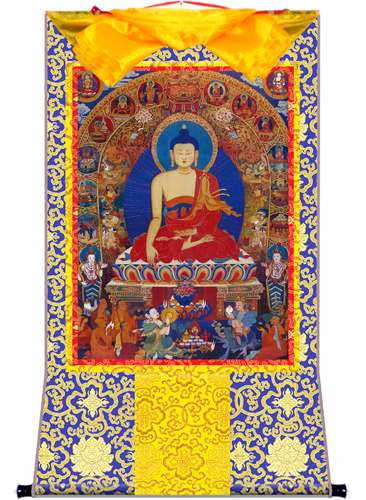 因是佛教圣相,所以我們選用的裝裱材料均是現在能有的最好的裝裱材料,正面選用定制的高檔棉織金絲錦緞很多仿制的是化纖材料,織繡藏傳佛教的富貴蓮花圖案,背面使用加厚仿真絲黃色綢緞布,手工精細裝裱而成,帶掛軸,照面,可直接懸掛到墻上。