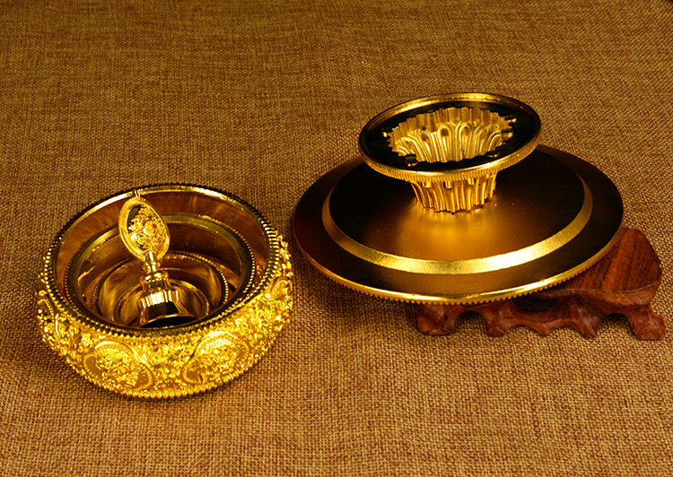 供曼扎/曼茶羅 積累資糧 曼扎盤,又稱曼扎或曼茶羅,是藏文音譯,是藏傳佛教中常見的法器。象征把整個宇宙縮小在上面,加以實物,觀想而作供養,是密宗迅速積聚福德與智慧的巧妙方法。 曼扎細分有三身曼扎供,七堆曼扎供和三十七堆曼扎供;又有以裝七塔。曼扎,在藏語中有“壇城”的意思。“壇城”在梵文中叫“曼荼羅”。密宗在修秘法時,為抵御妖魔侵擾,就在修法之地劃一圓圈或建一土壇,并上面畫上佛菩薩像。這就是“壇城”或“曼荼羅”。曼扎中表示的壇城為須彌山壇城。 曼扎盤一般有四層,每一層都形成中空的環狀,其內放上五谷雜糧、珍珠、瑪瑙、松石、貝殼及錢幣等物。第四層之上,是螺塔狀須彌山。佛教認為,須彌山是帝釋天和四大天王居住的地方,據說此山處于大海之中,山高八萬四千由旬,山頂有三十二座天宮,為帝釋天所居住。山腰有四大天王的宮殿。這些宮殿都是用金銀、水晶、玻璃等建造,極其華美富麗。此處的須彌山代表了整個世界。曼扎盤內的糧食和寶石用來供養諸佛菩薩。 |