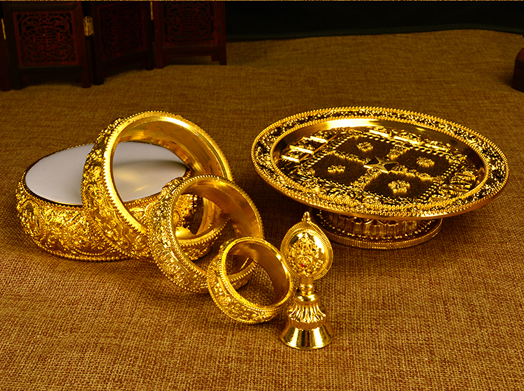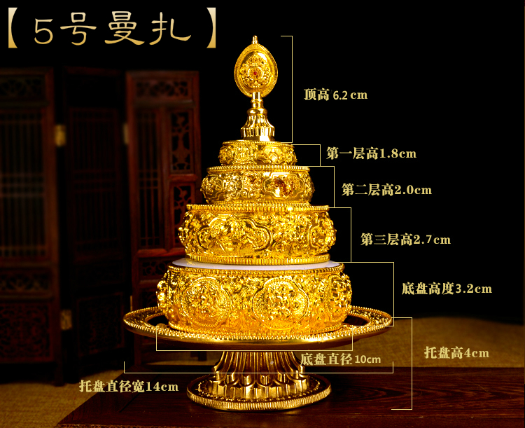 | 本公司大部分商品6一10天到貨。不接急單。急單的客戶請不要下單。感謝諒解與合作! 品名:曼扎盤 、曼茶羅 工藝:鍍金 不褪色 材質:鋅合金 尺寸: 1號曼扎托盤直徑20cm 底盤約17.5cm 裝藏后高度約35cm、重約2.8kg 2號曼扎直徑托盤20cm 底盤約15cm 高度約33cm、重約2.6kg 3號曼扎直徑托盤18cm 底盤約14cm 高度約28.5cm、凈重約2kg 4號曼扎托盤直徑16cm,底盤徑12.5cm,高約24cm,重約1.6kg 5號曼扎托盤14cm 底盤約10cm 高度約20cm、重約1kg 1號曼扎裝藏寶石需要3.5-4斤左右、2號曼扎裝藏寶石需要3-3.5斤左右、 3號曼裝藏寶石需要3斤左右、4號曼扎裝藏寶石需要2.5斤左右、5號曼扎裝藏寶石需要1.5-2斤左右 溫馨提示:任何工藝品都沒有完美的,追求完美者慎拍;由于每個制作批次不同以及拍攝的光線因素影響,每個批次之間的物品可能會存在一點不同,比如色差,但不影響美觀,請以收到的實物為準; 如需裝藏寶石,請點擊下面鏈接請購:http://item.taobao.com/item.htm?spm=a1z10.3.w4002-2093438198.9.fGhTsV&id=