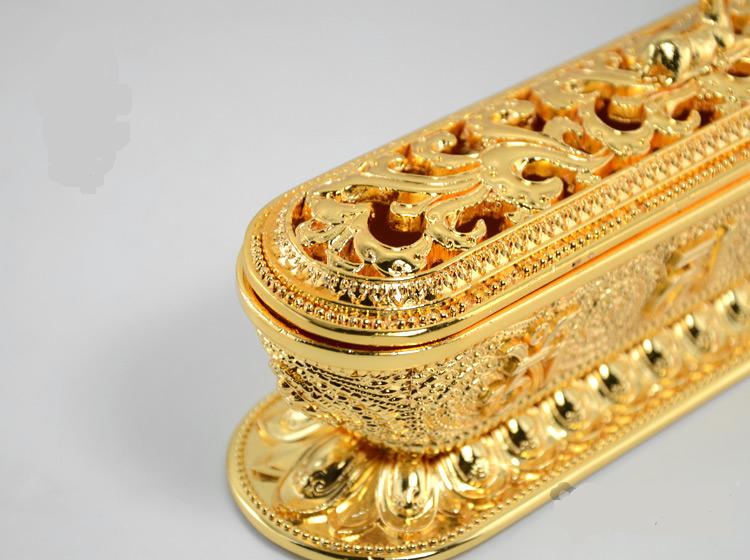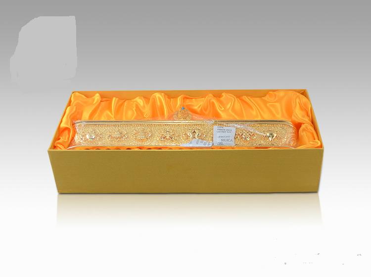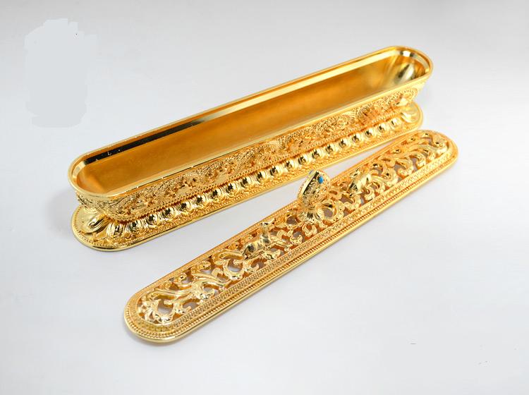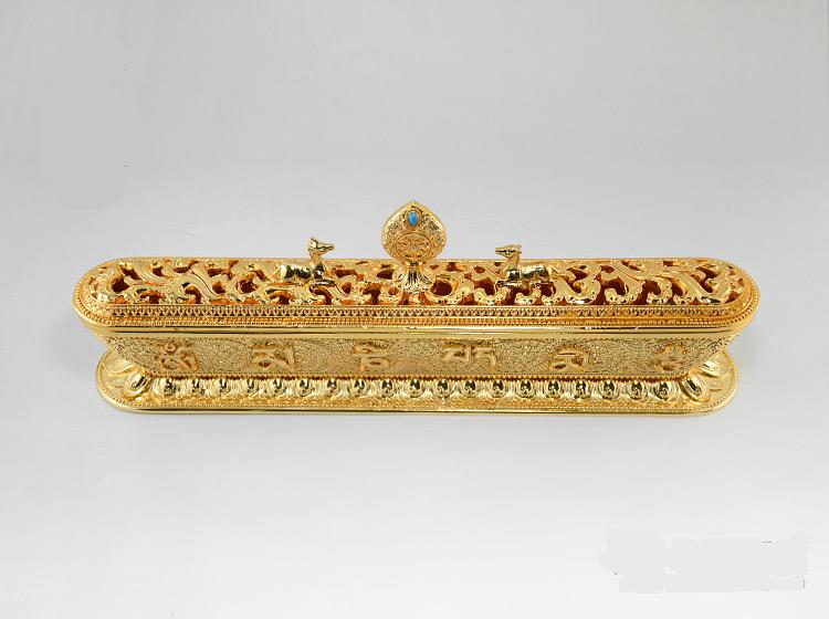 商品名稱:精品鍍金臥香爐 精美禮品包裝 材質:合金,外鍍金 規格:總長約32cm,高約5cm除香爐蓋外,底座部分寬約6cm 工藝:藏式臥爐,頂部雙鹿法輪,爐身一面為八吉祥,一面為六字大明咒,工藝精美,紋飾清晰細膩。 供香應當講究一定的方法與儀軌。供香的方法及內容,各經論所記載有多種,結合各經典儀軌中的供香方法,我們認為應當按照以下方式來供香。 在供香之前,首先要洗手、漱口,端正衣冠,身心寂靜安定。此為清凈身心。在所奉養的佛菩薩、本尊圣像之前,恭敬合掌,眼中觀察佛教光明圣像,思惟佛陀及一切圣眾的功德巍巍,一心誠敬供養,就如同佛菩薩現在眼前一般,此為供佛。 接著,我們拈起所供養之香,燃香持至胸前。持誦“金剛香菩薩真言”,此為持誦燒香真言。如果有人專門供養某位佛菩薩,這時可以特別持念:一心奉請南無某某佛。比如,一心奉請,南無本師釋迦牟尼佛;一心奉請,南無阿彌陀佛;一心奉請,南無大悲觀?酪羝腥?? 供香者可以隨自己的能力運心觀想,一心觀想所奉請諸圣眾,放出廣大光明,來到眼前,接受我們的供養,并歡喜受用。 上香時,用大拇指、食指將香夾住,余三指合攏,雙手將香平舉至眉齊,觀想佛菩薩顯現在我們的眼前,接受香供養。如果人很多時,將香直舉向上,以免燒到他人,然后走到距佛像三步遠的距離,舉香觀想拜佛。上香時以一支為宜,若要上三支香,則將第一支香插中間口念,供養佛、第二支香插右邊口念供養法、第三支插左邊口念供養僧、合掌供養一切眾生,愿此香華云,遍十方界,供養一切佛,尊法諸賢圣。 |