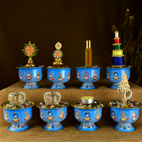 | 本公司大部分商品6一10天到貨。不接急單。急單的客戶請不要下單。感謝諒解與合作! 名稱:佛前八供特惠套裝 重量:約4.5kg 規格:杯口直徑約10cm,高約7.5cm大號 材質:合金彩繪 【套裝內容】 1、精美彩繪八供杯一套8個 2、香塔一個 3、海螺一個 4、純正香油一瓶 5、高檔精品花食子一對 6、水晶杯2個寬度約5厘米 7、七寶石約5.5斤小店也有硨磲可以配,如需硨磲請聯系客服 此款供杯為大號紅色款式,小店也有藍色杯子和黃色杯子的套裝組合出售,如有需要藍色的或者黃色杯子套裝,可以給我們留言或者直接聯系客服告知,沒有要求的,我們將默認發紅色款式;