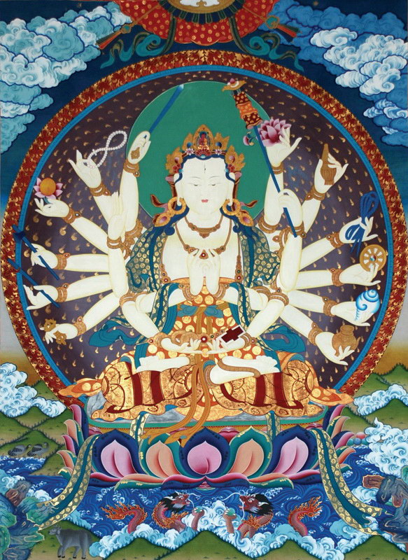 因是佛教圣相,所以我們選用的裝裱材料均是現在能有的最好的裝裱材料,正面選用定制的高檔棉織金絲錦緞很多仿制的是化纖材料,織繡藏傳佛教的富貴蓮花圖案,背面使用加厚仿真絲黃色綢緞布,手工精細裝裱而成,帶掛軸,照面,可直接懸掛到墻上。