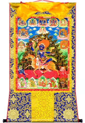 因是佛教圣相,所以我們選用的裝裱材料均是現在能有的最好的裝裱材料,正面選用定制的高檔棉織金絲錦緞很多仿制的是化纖材料,織繡藏傳佛教的富貴蓮花圖案,背面使用加厚仿真絲黃色綢緞布,手工精細裝裱而成,帶掛軸,照面,可直接懸掛到墻上。