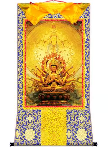 因是佛教圣相,所以我們選用的裝裱材料均是現在能有的最好的裝裱材料,正面選用定制的高檔棉織金絲錦緞很多仿制的是化纖材料,織繡藏傳佛教的富貴蓮花圖案,背面使用加厚仿真絲黃色綢緞布,手工精細裝裱而成,帶掛軸,照面,可直接懸掛到墻上。