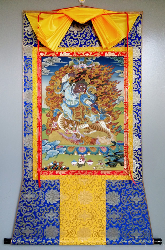 因是佛教圣相,所以我們選用的裝裱材料均是現在能有的最好的裝裱材料,正面選用定制的高檔棉織金絲錦緞很多仿制的是化纖材料,織繡藏傳佛教的富貴蓮花圖案,背面使用加厚仿真絲黃色綢緞布,手工精細裝裱而成,帶掛軸,照面,可直接懸掛到墻上。