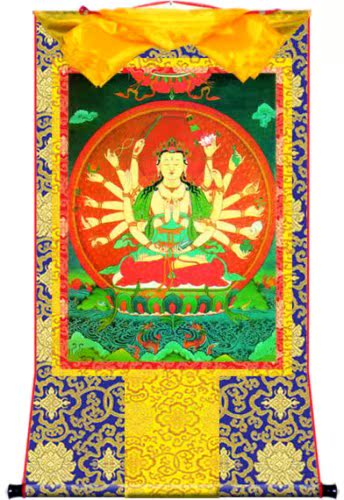因是佛教圣相,所以我們選用的裝裱材料均是現在能有的最好的裝裱材料,正面選用定制的高檔棉織金絲錦緞很多仿制的是化纖材料,織繡藏傳佛教的富貴蓮花圖案,背面使用加厚仿真絲黃色綢緞布,手工精細裝裱而成,帶掛軸,照面,可直接懸掛到墻上。