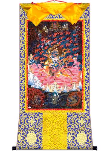 因是佛教圣相,所以我們選用的裝裱材料均是現在能有的最好的裝裱材料,正面選用定制的高檔棉織金絲錦緞很多仿制的是化纖材料,織繡藏傳佛教的富貴蓮花圖案,背面使用加厚仿真絲黃色綢緞布,手工精細裝裱而成,帶掛軸,照面,可直接懸掛到墻上。