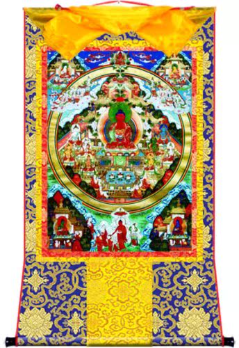 因是佛教圣相,所以我們選用的裝裱材料均是現在能有的最好的裝裱材料,正面選用定制的高檔棉織金絲錦緞很多仿制的是化纖材料,織繡藏傳佛教的富貴蓮花圖案,背面使用加厚仿真絲黃色綢緞布,手工精細裝裱而成,帶掛軸,照面,可直接懸掛到墻上。