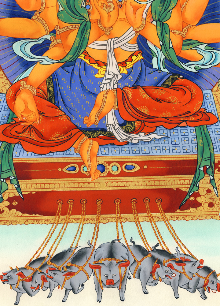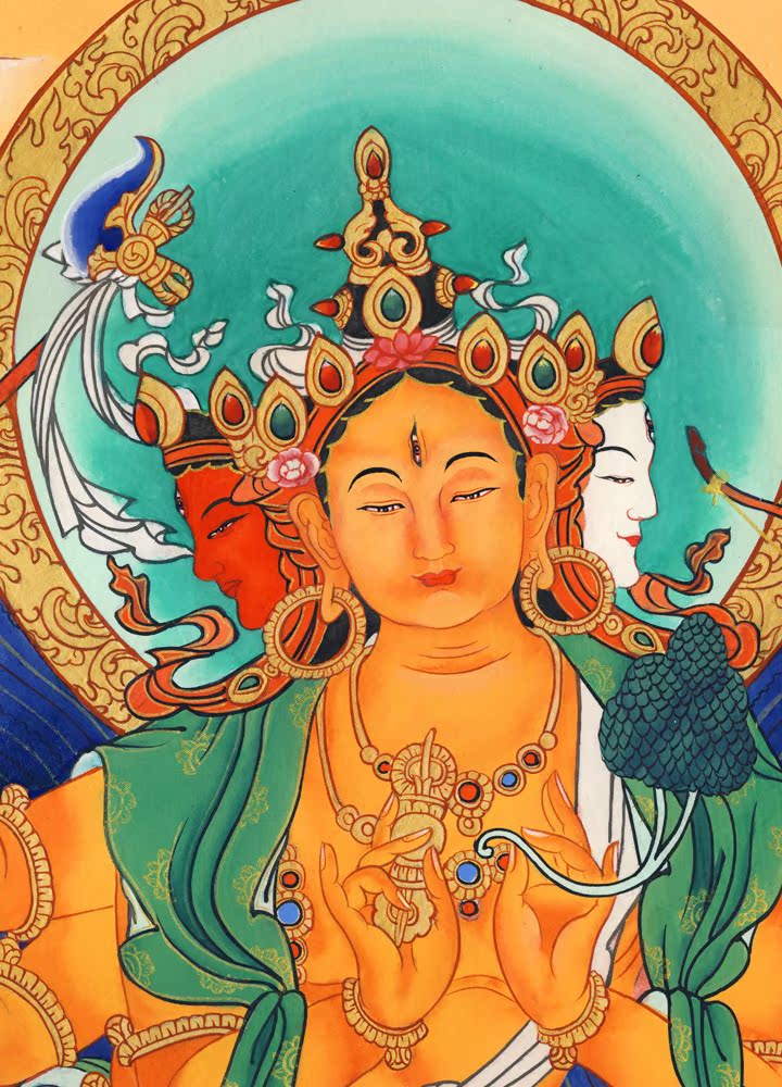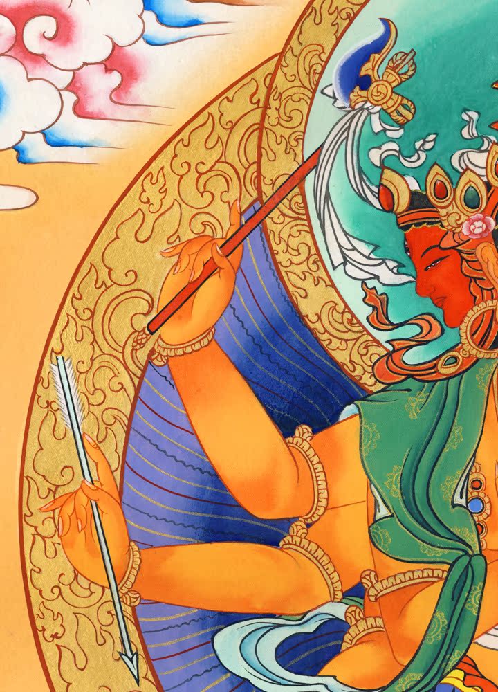 因是佛教圣相,所以我們選用的裝裱材料均是現在能有的最好的裝裱材料,正面選用定制的高檔棉織金絲錦緞很多仿制的是化纖材料,織繡藏傳佛教的富貴蓮花圖案,背面使用加厚仿真絲黃色綢緞布,手工精細裝裱而成,帶掛軸,照面,可直接懸掛到墻上。