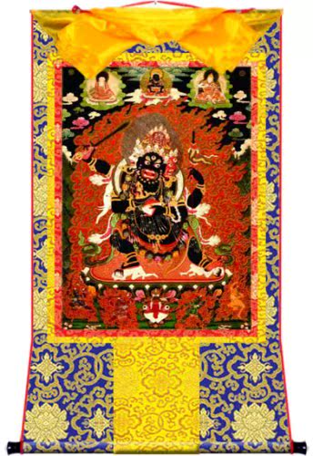 因是佛教圣相,所以我們選用的裝裱材料均是現在能有的最好的裝裱材料,正面選用定制的高檔棉織金絲錦緞很多仿制的是化纖材料,織繡藏傳佛教的富貴蓮花圖案,背面使用加厚仿真絲黃色綢緞布,手工精細裝裱而成,帶掛軸,照面,可直接懸掛到墻上。