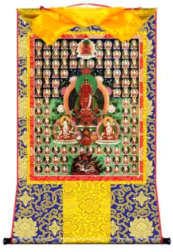 因是佛教圣相,所以我們選用的裝裱材料均是現在能有的最好的裝裱材料,正面選用定制的高檔棉織金絲錦緞很多仿制的是化纖材料,織繡藏傳佛教的富貴蓮花圖案,背面使用加厚仿真絲黃色綢緞布,手工精細裝裱而成,帶掛軸,照面,可直接懸掛到墻上。