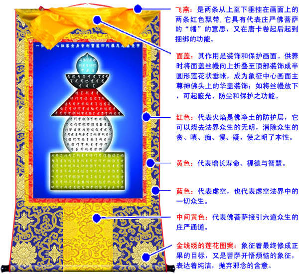 式樣和材料 因是佛教圣相,所以我們選用的裝裱材料均是現在能有的最好的材料,正面選用定制的高檔棉織金絲錦緞很多仿制的是化纖材料,織繡藏傳佛教的富貴蓮花圖案,背面使用高檔的裝裱錦綾,手工精細裝裱而成,帶掛軸,照面,可直接懸掛到墻上。 畫面:畫面采用布料很多燙金唐卡畫面用的是紙的材料,和布的不可相比,壓燙金線制作。 工藝:手工精細裝裱。 精細到每個細節,讓佛畫更顯精致 唐卡的裝裱款式有很多種,我們選用了最為傳統的一種,這種裝裱方式多為寺廟使用,代表的意義也很殊勝。