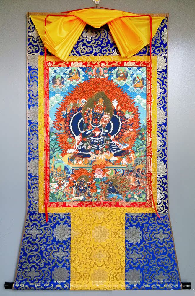 因是佛教圣相,所以我們選用的裝裱材料均是現在能有的最好的裝裱材料,正面選用定制的高檔棉織金絲錦緞很多仿制的是化纖材料,織繡藏傳佛教的富貴蓮花圖案,背面使用加厚仿真絲黃色綢緞布,手工精細裝裱而成,帶掛軸,照面,可直接懸掛到墻上。